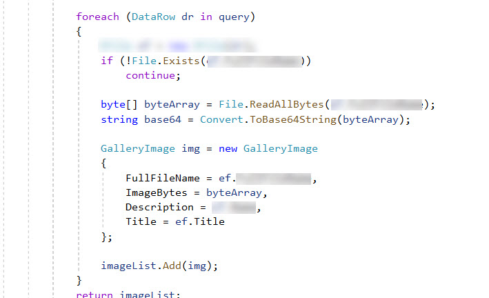 One thing that I would note right away... the code I am using loads up the image gallery with a list of images that have been loaded up into memory using byte array, not static files. The reason is that the list of images to display are read from a directory that our IIS account does not have access to for a variety of reasons.