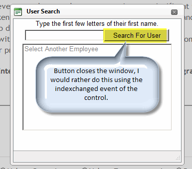 I have been having some issues using the RadWindow as a container with a custom control. The control has a button that searches Active Directory users and it populates a listbox. The indexchange event of the list box should close the window and return properties of the user selected. However, whenever I click the button to search for a user, the window closes. How can this be prevented?