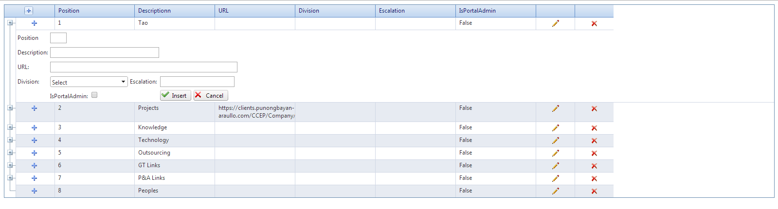 <telerik:RadAjaxPanel ID="pnl" runat="server"> <telerik:RadTreeList ID="rdlMenu" Skin="Office2007" runat="server" DataKeyNames="Id" ParentDataKeyNames="ParentId" AutoGenerateColumns="false" OnItemCommand="rdlMenu_ItemCommand" OnNeedDataSource="rdlMenu_NeedDataSource" OnInsertCommand="rdlMenu_InsertCommand" OnItemCreated="rdlMenu_ItemCreated"> <Columns> <telerik:TreeListEditCommandColumn UniqueName="InsertCommandColumn" ButtonType="ImageButton" ShowEditButton="false" ItemStyle-HorizontalAlign="Center" HeaderStyle-HorizontalAlign="Center" HeaderStyle-Width="80px"></telerik:TreeListEditCommandColumn> <telerik:TreeListBoundColumn DataField="Id" UniqueName="Id" HeaderText="Id" Display="false"> </telerik:TreeListBoundColumn> <telerik:TreeListBoundColumn DataField="ParentId" UniqueName="ParentId" HeaderText="ParentId" Display="false"> </telerik:TreeListBoundColumn> <telerik:TreeListBoundColumn DataField="Position" UniqueName="Position" HeaderText="Position"> </telerik:TreeListBoundColumn> <telerik:TreeListBoundColumn DataField="Description" UniqueName="Description" HeaderText="Descriptionn"> </telerik:TreeListBoundColumn> <telerik:TreeListBoundColumn DataField="URL" UniqueName="URL" HeaderText="URL"> </telerik:TreeListBoundColumn> <telerik:TreeListBoundColumn DataField="Division" UniqueName="Division" HeaderText="Division"> </telerik:TreeListBoundColumn> <telerik:TreeListBoundColumn DataField="Escalation" UniqueName="Escalation" HeaderText="Escalation"> </telerik:TreeListBoundColumn> <telerik:TreeListBoundColumn DataField="IsPortalAdmin" UniqueName="IsPortalAdmin" HeaderText="IsPortalAdmin"> </telerik:TreeListBoundColumn> <telerik:TreeListButtonColumn CommandName="Edit" Text="Edit" UniqueName="EditCommandColumn" ButtonType="ImageButton" ItemStyle-HorizontalAlign="Center" HeaderStyle-Width="80px"></telerik:TreeListButtonColumn> <telerik:TreeListButtonColumn UniqueName="DeleteCommandColumn" Text="Delete" CommandName="Delete" ButtonType="ImageButton" ItemStyle-HorizontalAlign="Center" HeaderStyle-Width="80px"></telerik:TreeListButtonColumn> </Columns> <EditFormSettings EditFormType="Template"> <FormTemplate> <div class="editTemplate"> <asp:HiddenField ID="hdnId" runat="server" Value='<%# Bind("Id") %>' /> <asp:HiddenField ID="hdnParentId" runat="server" Value='<%# Bind("ParentId") %>' /> <table> <tr> <td>Position</td> <td> <asp:TextBox ID="txtPosition" Text='<%# Bind("Position") %>' runat="server" Width="30px"> </asp:TextBox></td> </tr> <tr> <td>Description: </td> <td colspan="2"> <asp:TextBox ID="txtDescription" Text='<%# Bind("Description") %>' runat="server" Width="100%"> </asp:TextBox> </td> <td></td> </tr> <tr> <td>URL: </td> <td colspan="3"> <asp:TextBox ID="txtURL" Text='<%# Bind("URL") %>' runat="server" Width="100%"> </asp:TextBox> </td> <td></td> <td></td> </tr> <tr> <td>Division: </td> <td> <asp:TextBox ID="txtDivision" Text='<%# Bind("Division") %>' runat="server" Width="100%"> </asp:TextBox> </td> <td>Escalation: </td> <td> <asp:TextBox ID="TextBox4" Text='<%# Bind("Escalation") %>' runat="server"> </asp:TextBox> </td> </tr> <tr> <td></td> <td>IsPortalAdmin: <asp:CheckBox ID="chkAdmin" runat="server" /> </td> <td></td> <td> <telerik:RadButton ID="btnUpdate" Text='<%# (Container is TreeListEditFormInsertItem) ? "Insert" : "Update" %>' runat="server" CommandName='<%# (Container is TreeListEditFormInsertItem) ? "PerformInsert" : "Update" %>' Icon-PrimaryIconCssClass="rbOk"> </telerik:RadButton> <telerik:RadButton ID="btnCancel" Text="Cancel" runat="server" CausesValidation="False" CommandName="Cancel" Icon-PrimaryIconCssClass="rbCancel"> </telerik:RadButton> </td> </tr> </table> </div> </FormTemplate> </EditFormSettings> </telerik:RadTreeList>