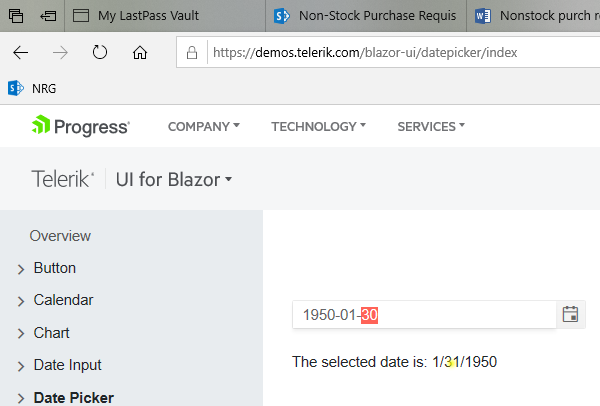 <TelerikDatePicker Min="@Min" Max="@Max" @bind-Value="@selectedDate"></TelerikDatePicker><div class="pt-4">The selected date is: @selectedDate</div>@code { public DateTime Max = new DateTime(2050, 12, 31); public DateTime Min = new DateTime(1950, 1, 1); private DateTime? selectedDate { get; set; } = DateTime.Now;}Does running this snippet in a client-side Blazor app make a difference on your end? I am asking this to see if some browser input may be the issue, or if the SignalR connection may be causing this - a purely client blazor app does not transmit data to a server backend and everything happens inside the browser through wasm.