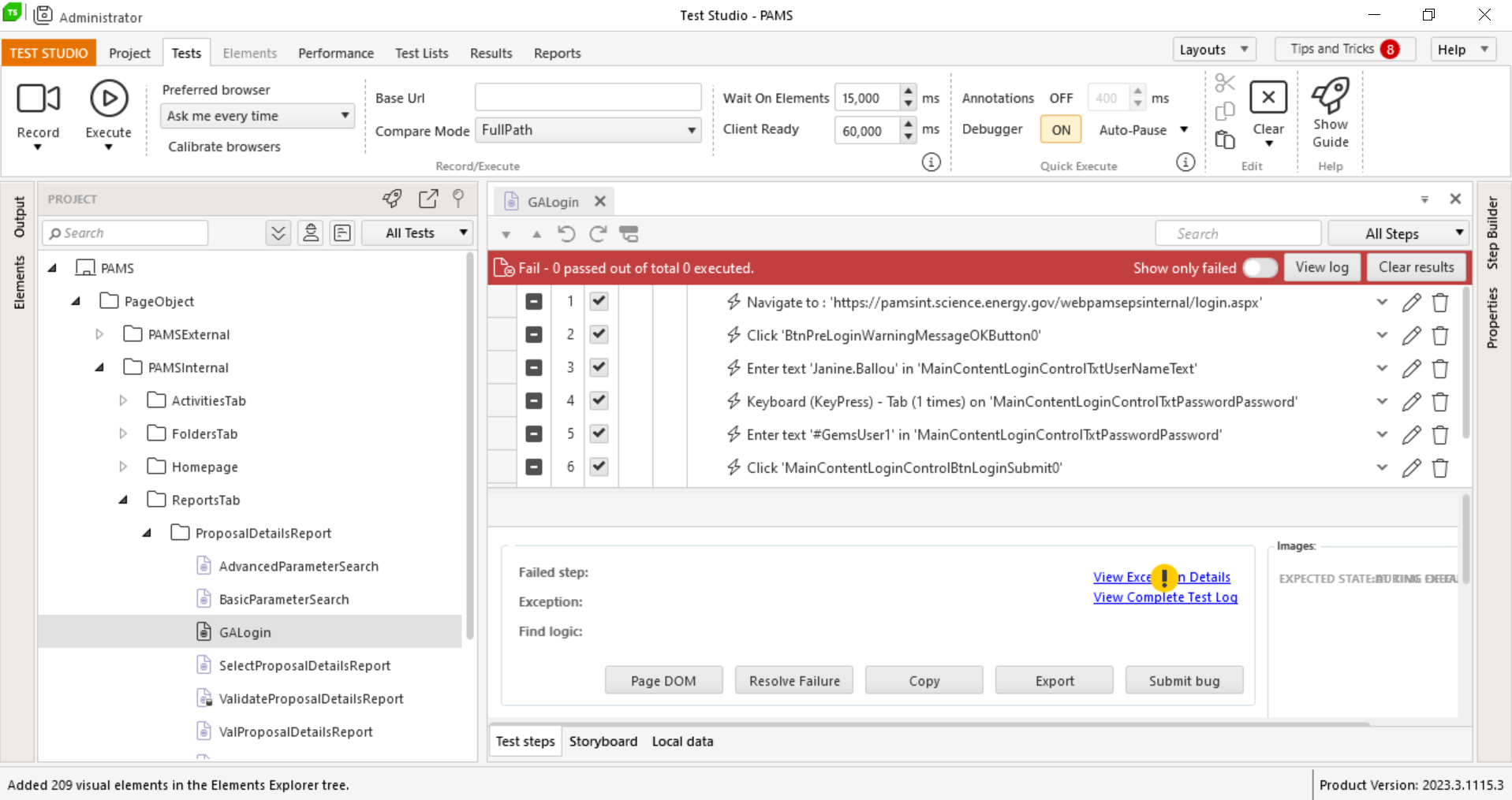 Previously working tests are no longer executing successfully. See below screenshot. Also, if I attempt to make a change and save, Test Studio automatically closes and changes are not saved.