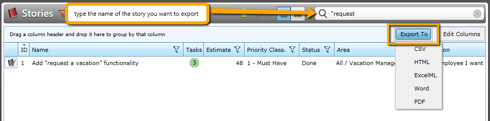 Kamen's screenshot is showing the basic View Stories screen (in the ribbon choose the Requirements tab, then View Stories button). He has then used the small search filter above the grid to limit the results to just the story he would like to print details of. He then uses the Export To button to create a document including all of the information visible within the grid. You can use the Edit Columns button to add or remove columns from the grid, which will then impact the data that the Export To button prints out.
