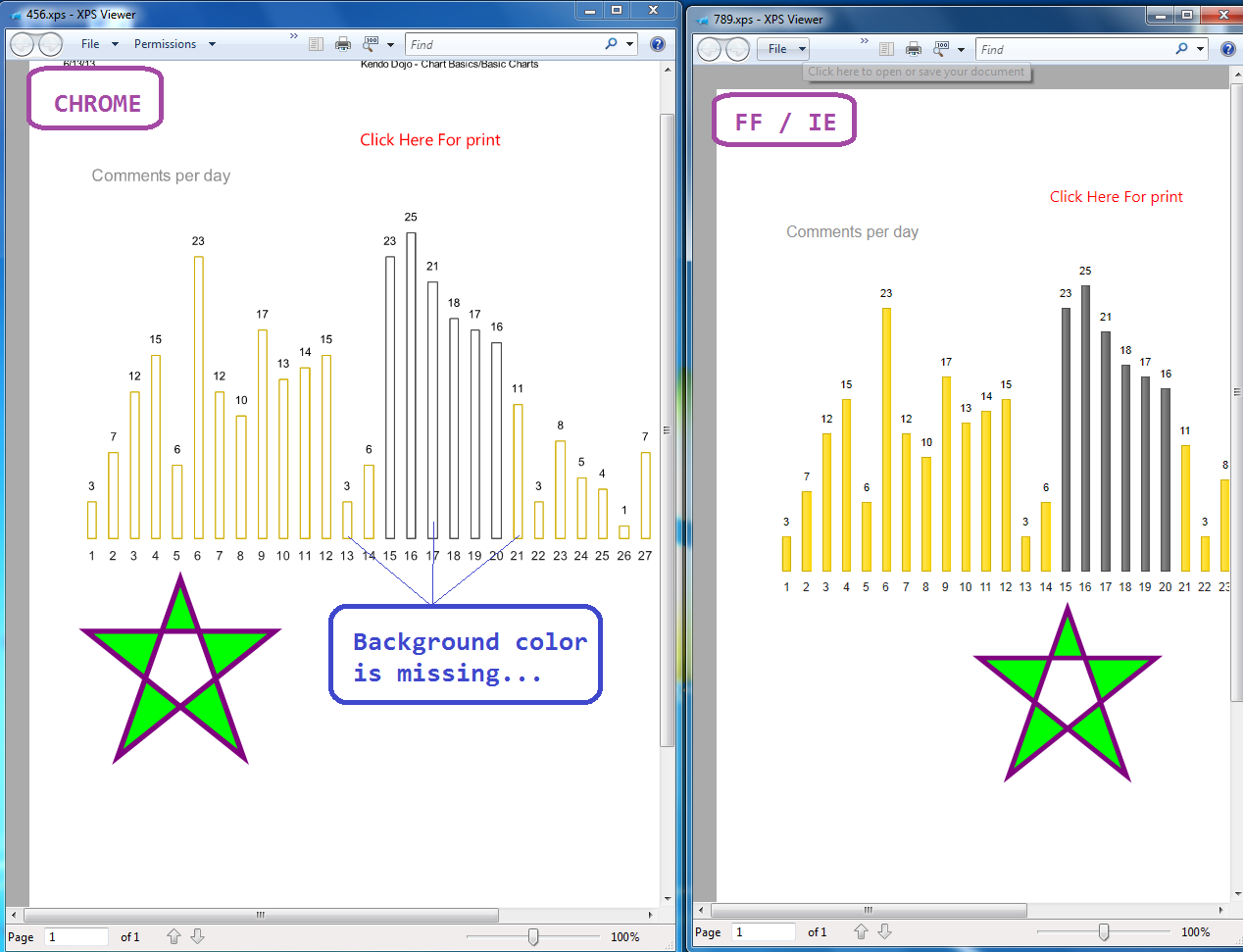 <a id="jayeshgoyani" class="MyCLass" >Click Here For print</a><div class="chart-wrapper"> <div id="chart"></div> </div><svg xmlns="http://www.w3.org/2000/svg" version="1.1" height="190"> <polygon points="100,10 40,180 190,60 10,60 160,180" style="fill:lime;stroke:purple;stroke-width:5;fill-rule:evenodd;"></svg> var blogComments = [ { "blog": "My blog", "day": "1", "value": 3, "userColor": "#ffd600" }, { "blog": "My blog", "day": "2", "value": 7, "userColor": "#ffd600" }, { "blog": "My blog", "day": "3", "value": 12, "userColor": "#ffd600" }, { "blog": "My blog", "day": "4", "value": 15, "userColor": "#ffd600" }, { "blog": "My blog", "day": "5", "value": 6, "userColor": "#ffd600" }, { "blog": "My blog", "day": "6", "value": 23, "userColor": "#ffd600" }, { "blog": "My blog", "day": "7", "value": 12, "userColor": "#ffd600" }, { "blog": "My blog", "day": "8", "value": 10, "userColor": "#ffd600" }, { "blog": "My blog", "day": "9", "value": 17, "userColor": "#ffd600" }, { "blog": "My blog", "day": "10", "value": 13, "userColor": "#ffd600" }, { "blog": "My blog", "day": "11", "value": 14, "userColor": "#ffd600" }, { "blog": "My blog", "day": "12", "value": 15, "userColor": "#ffd600" }, { "blog": "My blog", "day": "13", "value": 3, "userColor": "#ffd600" }, { "blog": "My blog", "day": "14", "value": 6, "userColor": "#ffd600" }, { "blog": "My blog", "day": "15", "value": 23, "userColor": "#565656" }, { "blog": "My blog", "day": "16", "value": 25, "userColor": "#565656" }, { "blog": "My blog", "day": "17", "value": 21, "userColor": "#565656" }, { "blog": "My blog", "day": "18", "value": 18, "userColor": "#565656" }, { "blog": "My blog", "day": "19", "value": 17, "userColor": "#565656" }, { "blog": "My blog", "day": "20", "value": 16, "userColor": "#565656" }, { "blog": "My blog", "day": "21", "value": 11, "userColor": "#ffd600" }, { "blog": "My blog", "day": "22", "value": 3, "userColor": "#ffd600" }, { "blog": "My blog", "day": "23", "value": 8, "userColor": "#ffd600" }, { "blog": "My blog", "day": "24", "value": 5, "userColor": "#ffd600" }, { "blog": "My blog", "day": "25", "value": 4, "userColor": "#ffd600" }, { "blog": "My blog", "day": "26", "value": 1, "userColor": "#ffd600" }, { "blog": "My blog", "day": "27", "value": 7, "userColor": "#ffd600" }, { "blog": "My blog", "day": "28", "value": 6, "userColor": "#ffd600" }, { "blog": "My blog", "day": "29", "value": 3, "userColor": "#ffd600" }, { "blog": "My blog", "day": "30", "value": 6, "userColor": "#ffd600" } ]; function createChart() { $("#chart").kendoChart({ dataSource: { data: blogComments }, title: { align: "left", text: "Comments per day" }, legend: { visible: false }, seriesDefaults: { type: "column", labels: { visible: true, background: "transparent" } }, series: [{ field: "value", colorField: "userColor" }], valueAxis: { max: 28, majorGridLines: { visible: false }, visible: false }, categoryAxis: { field: "day", majorGridLines: { visible: false }, line: { visible: false } } }); } $(document).ready(function() { setTimeout(function() { // Initialize the chart with a delay to make sure // the initial animation is visible createChart(); $("#example").bind("kendo:skinChange", function(e) { createChart(); }); $("#jayeshgoyani").bind("click", function(e) { PerviousDate(); }); }, 400); });function PerviousDate() { window.print();}CSS