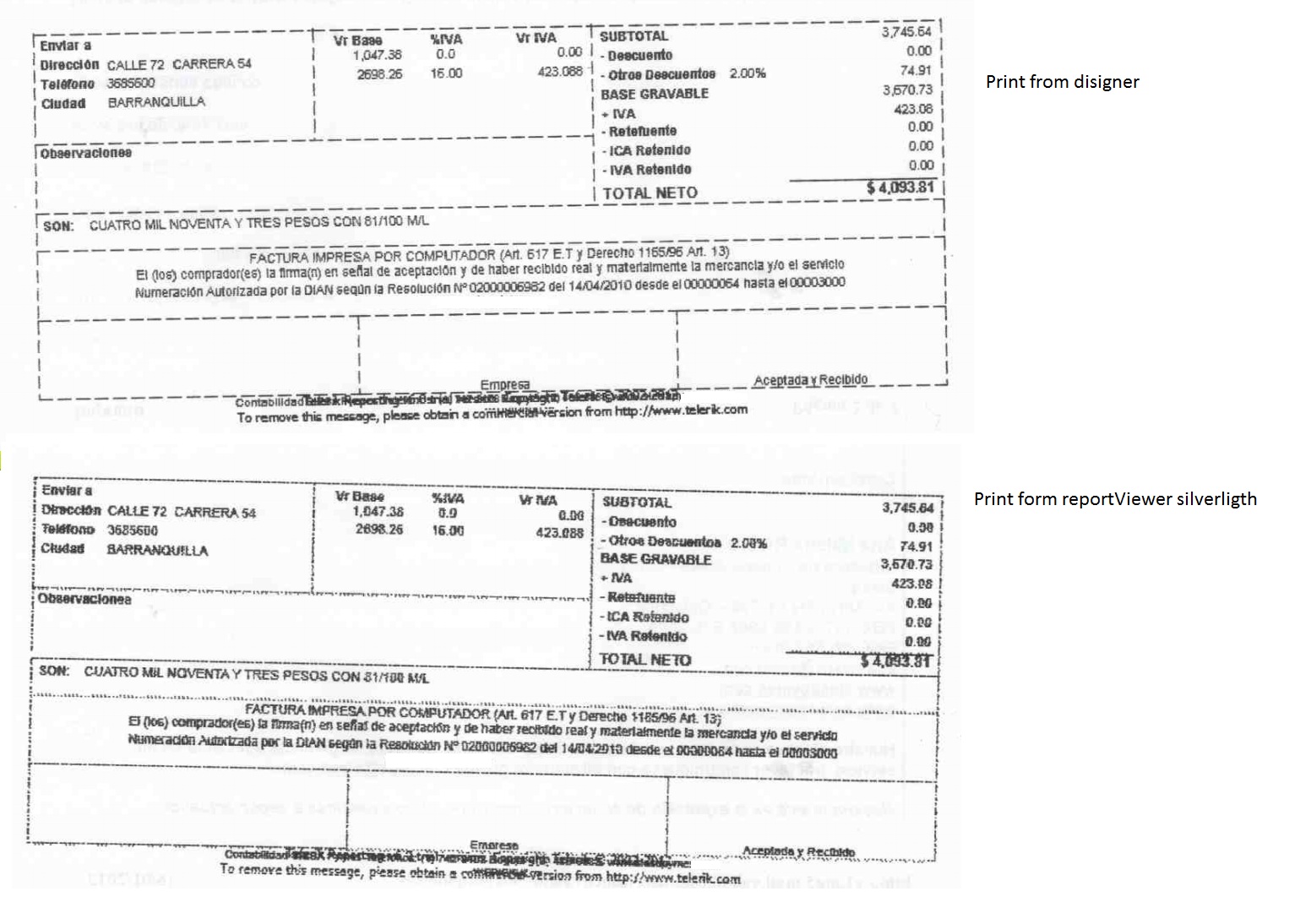 The print from ReportViewer Silverlight is unreadable, and the print from the disigner is good.