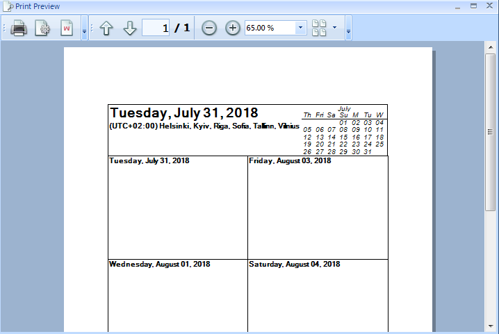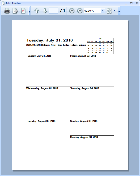 for my print preview is set the DrawPageTitleCalendar property to true.