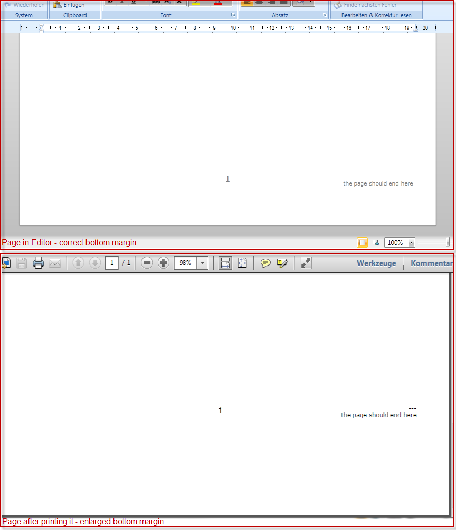 This solves the Problem in the sample project but not in ours. In the Editor the document is displayed correctly but printing the document is still buggy. We don't use comments in our Editor. If the Print-Window resizes the document to keep the ration it might has something to do with the the display mode in the editor. Even blank pages are not displayed correctly after printing.