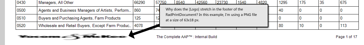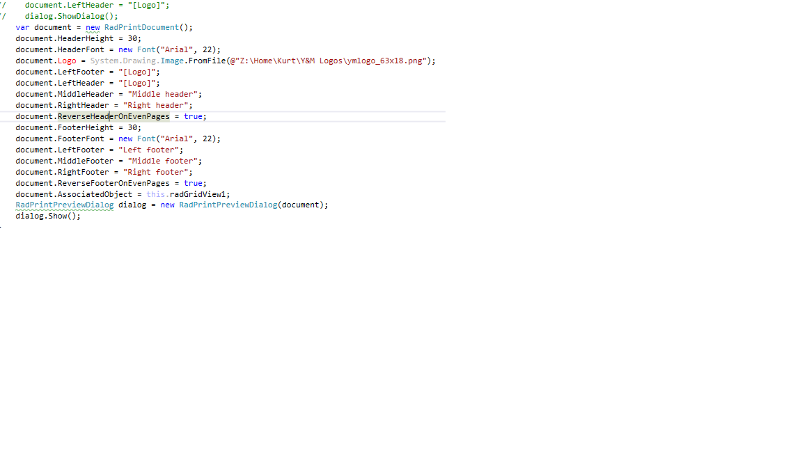 var doc = new RadPrintDocument();doc.HeaderHeight = 20;doc.FooterHeight = 18;doc.HeaderFont = new Font("Arial", 10, FontStyle.Bold);doc.FooterFont = new Font("Arial", 8, FontStyle.Regular);doc.LeftHeader = "Test Header";doc.Logo = System.Drawing.Image.FromFile(@"Z:\Home\Kurt\Y&M Logos\ymlogo_63x18.png");doc.LeftFooter = "[Logo]";doc.Landscape = true;doc.AssociatedObject = radGridView1;doc.Print();If I had the ability to set the Width of the LeftFooter, or force the size of the Logo, I'd be set, but I can't find a way to do this. Any ideas?