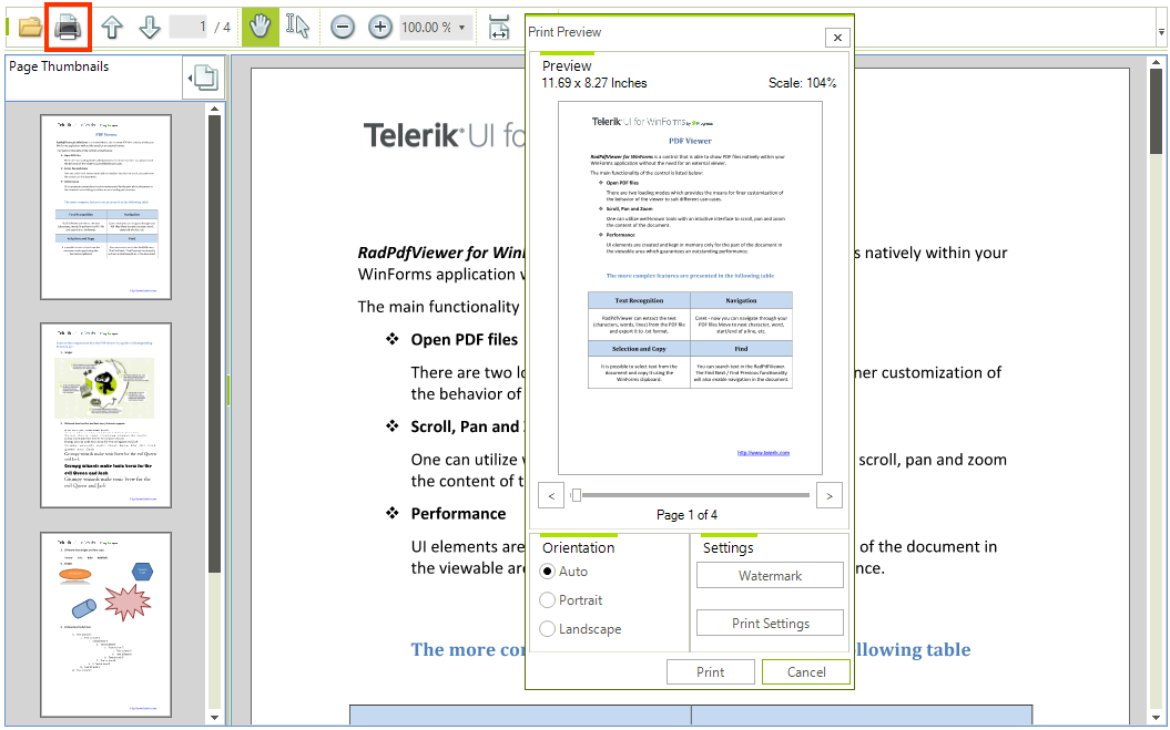 You can print a document by taking advantage of the Print() and Print(PrintSettings printSettings) methods of RadPdfViewer. However, PrintPreview dialog functionality such as the one in WinForms' PdfViewer is not implemented for WPF's PdfViewer. This is why I logged this as a feature request and also voted for it on your behalf - Add PrintPreview dialog. Please subscribe for this item in order to get notified when its changes.