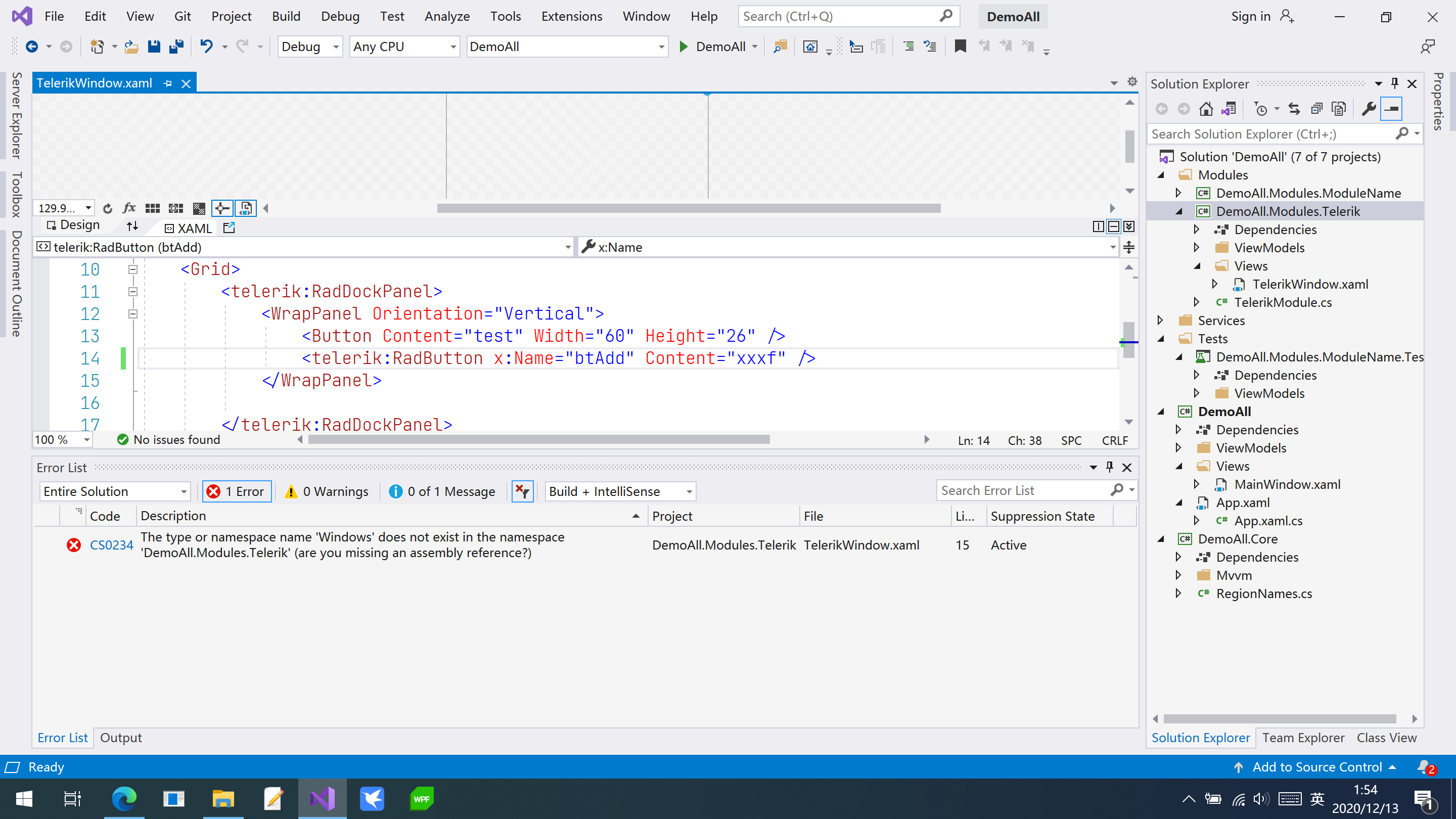 I've reproduced the error using the provided solution, however, I wasn't able to indicate what is the reason behind it. It looks like it is something related to the .NET Core 3.1 project setup, but it wasn't clear what exactly. I've managed to resolve this by creating a new WPF User Control Library (.NET) project with Visual Studio 2019 Preview (preferably the latest version). The new project should replace the original one - DemoAll.Modules.Telerik.