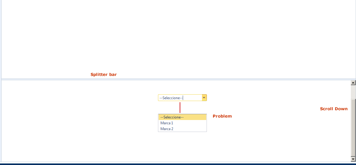 <style type="text/css"> .positionCombo { margin-top: 200px; margin-bottom: 100px; }</style><telerik:RadSplitter ID="RadSplitter1" runat="server" Orientation="Horizontal"> <telerik:RadPane ID="RadPane1" runat="server"> <telerik:RadComboBox ID="RadComboBox1" runat="server" CssClass="positionCombo"> <Items> <telerik:RadComboBoxItem Value="1" Text="1" /> <telerik:RadComboBoxItem Value="2" Text="2" /> <telerik:RadComboBoxItem Value="3" Text="3" /> <telerik:RadComboBoxItem Value="4" Text="4" /> <telerik:RadComboBoxItem Value="5" Text="5" /> </Items> </telerik:RadComboBox> </telerik:RadPane> <telerik:RadPane ID="RadPane2" runat="server"> </telerik:RadPane></telerik:RadSplitter><script type="text/javascript"> Sys.Application.add_load(function () { var splitter = $find("<%= RadSplitter1.ClientID %>"); var combo = $find("<%= RadComboBox1.ClientID %>"); var pane = splitter.getPaneById("<%= RadPane1.ClientID %>"); var paneElem = pane.getContentElement(); $telerik.addHandler(paneElem, "scroll", function () { combo.hideDropDown(); }, false); });</script>Regards,