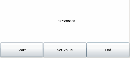 <UserControl x:Class="RadControlsSilverlightApp8.MainPage" xmlns:telerik="http://schemas.telerik.com/2008/xaml/presentation" mc:Ignorable="d" d:DesignWidth="640" d:DesignHeight="480"> <Grid x:Name="LayoutRoot"> <Grid.RowDefinitions> <RowDefinition /> <RowDefinition Height="50" /> </Grid.RowDefinitions> <Grid.ColumnDefinitions> <ColumnDefinition /> <ColumnDefinition /> <ColumnDefinition /> </Grid.ColumnDefinitions> <telerik:RadBusyIndicator x:Name="busyIndicator" BusyContent="Moment bitte ..." Grid.ColumnSpan="3" > <telerik:RadMaskedNumericInput x:Name="radMaskedNumericInput" HorizontalAlignment="Stretch" EmptyContent="Nothing" Mask="#10,5" TextMode="PlainText" TabNavigation="Local" FontSize="9" IsClearButtonVisible="False" AutoFillNumberGroupSeparators="false" AutoFillZeros="False" HorizontalContentAlignment="Center" BorderBrush="{x:Null}" Placeholder=" " MaxHeight="16" SelectionOnFocus="Default" SpinMode="None" UpdateValueEvent="PropertyChanged" Text="" /> </telerik:RadBusyIndicator> <Button Grid.Row="1" Content="Start" Click="Button_Click" /> <Button Grid.Row="1" Grid.Column="1" Content="Set Value" Click="Button_Click_2" /> <Button Grid.Row="1" Grid.Column="2" Content="End" Click="Button_Click_1" /> </Grid> </UserControl> Code behind:
