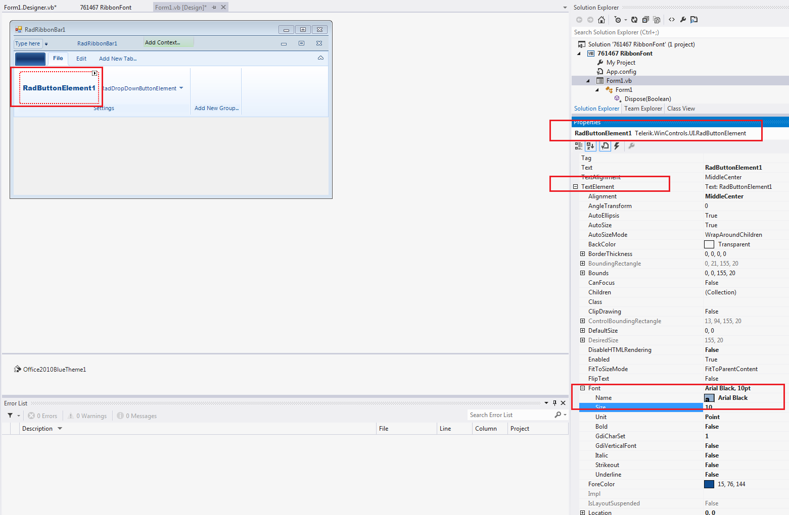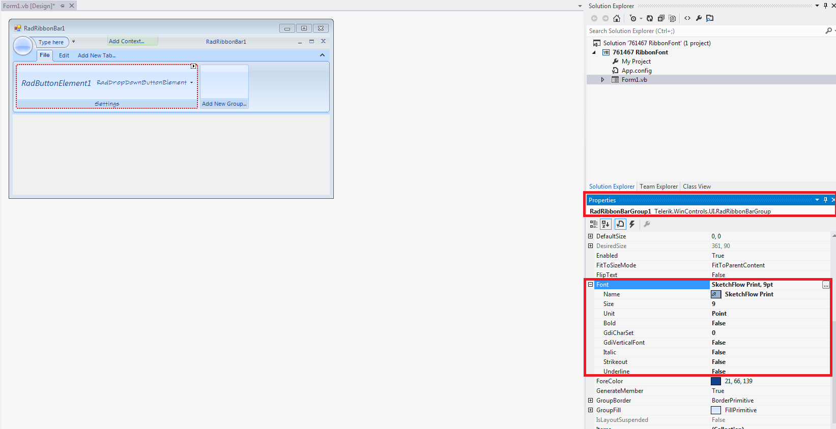 For Each c In rbgDocuments.Items 'rbgDocuments is RibbonbarGroup If TypeOf c Is Telerik.WinControls.UI.RadButtonElement Then c.TextElement.Font = New Font(Me.Font.FontFamily, 9) End IfNextBut I could not change the fonts in design-time and RibbonBarGroup's font.
