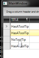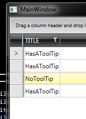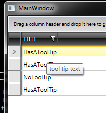using System.Windows;namespace ConditionalColumnToolTip{ /// <summary> /// Interaction logic for MainWindow.xaml /// </summary> public partial class MainWindow : Window { public MainWindow() { InitializeComponent(); DataContext = new ViewModel(); } }}And finally here is the XAML for the MainWindow.xaml that recreates the issue.