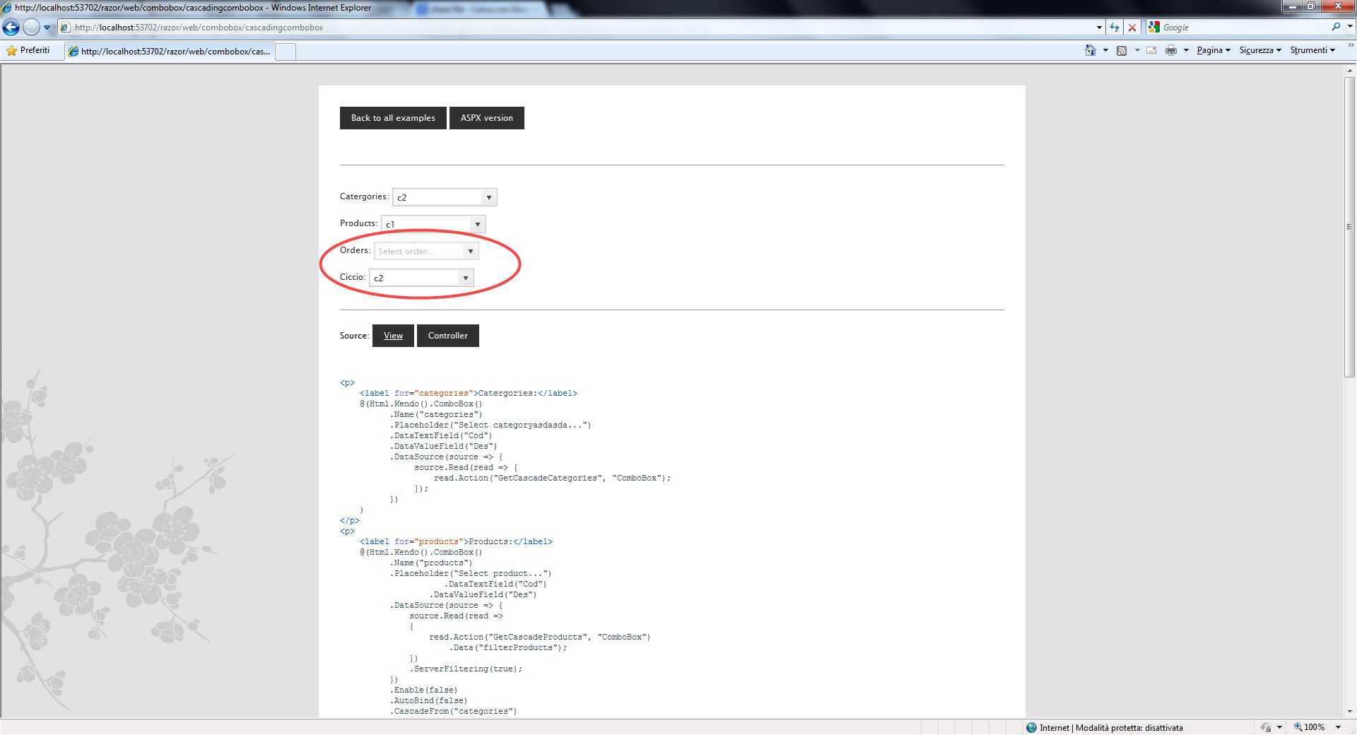 <p> <label for="categories">Catergories:</label> @(Html.Kendo().ComboBox() .Name("categories") .Placeholder("Select categoryasdasda...") .DataTextField("Cod") .DataValueField("Des") .DataSource(source => { source.Read(read => { read.Action("GetCascadeCategories", "ComboBox"); }); }) )</p><p> <label for="products">Products:</label> @(Html.Kendo().ComboBox() .Name("products") .Placeholder("Select product...") .DataTextField("Cod") .DataValueField("Des") .DataSource(source => { source.Read(read => { read.Action("GetCascadeProducts", "ComboBox") .Data("filterProducts"); }) .ServerFiltering(true); }) .Enable(false) .AutoBind(false) .CascadeFrom("categories") ) <script> function filterProducts() { return { categories: $("#categories").val() }; } </script></p><p> <label for="orders">Orders:</label> @(Html.Kendo().ComboBox() .Name("orders") .Placeholder("Select order...") .DataTextField("Cod") .DataValueField("Des") .DataSource(source => { source.Read(read => { read.Action("GetCascadeOrders", "ComboBox") .Data("filterOrders"); }) .ServerFiltering(true); }) .Enable(false) .AutoBind(false) .CascadeFrom("products") ) <script> function filterOrders() { return { products: $("#filterOrders").val() }; } </script></p><p> <label for="ciccio">Ciccio:</label> @(Html.Kendo().ComboBox() .Name("ciccio") .Placeholder("Select order...") .DataTextField("Cod") .DataValueField("Des") .DataSource(source => { source.Read(read => { read.Action("GetCascadeciccio", "ComboBox").Data("filterCiccio"); }) .ServerFiltering(true); }) .AutoBind(false) .CascadeFrom("orders") ) <script> function filterCiccio() { return { ciccio: $("#filterCiccio").val() }; } </script></p>0