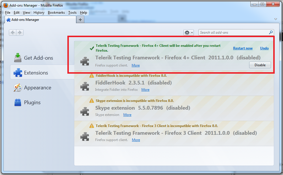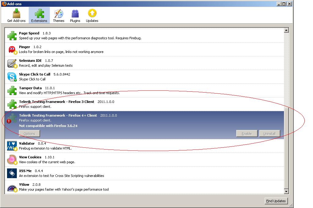 I noticed that on Firefox Telerik Add-on for Client 4 is not enabled and I do not have the option to enable it :(. It dislpays the red mark icon on add-on. but Telerik Add-on for client 3 is enabled and I am using the firefox version 3.6.24. So the Telerik Add-on for client 3