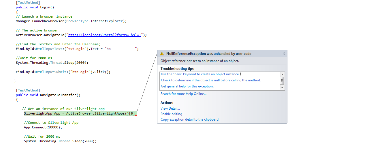 at SilverlightAutomation.SilverlightUnitTests.NavigateToTransfer() in C:\Users\nitinahu\documents\visual studio 2010\Projects\SilverlightAutomation\SilverlightAutomation\SilverlightUnitTests.cs:line 196