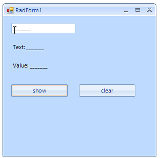 public RadForm1() { InitializeComponent(); } private void radButton1_Click(object sender, EventArgs e) { radLabel1.Text = "pre clear value = " + order_city_eb.Value; radLabel2.Text = "pre clear text = " + order_city_eb.Text; order_city_eb.Clear(); } private void radButton2_Click(object sender, EventArgs e) { radLabel1.Text = "value = " + order_city_eb.Value; radLabel2.Text = "text = " + order_city_eb.Text; }