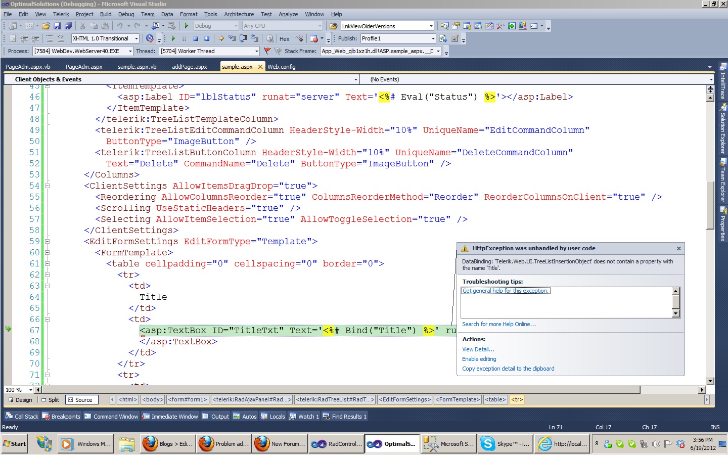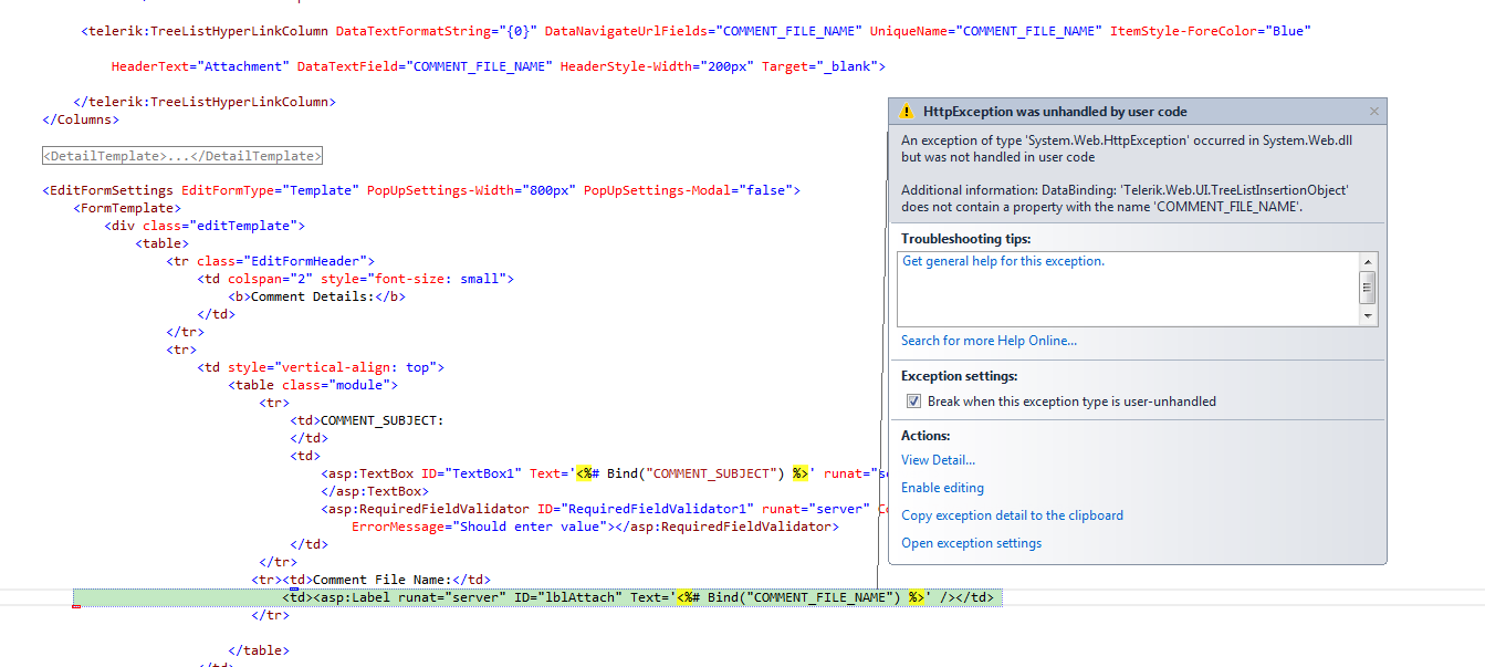 I am using RadTreeList control. I used the EditFormSetting with EditFormType='Template'. In that template I am bounding the values to server control with the help of Bind function. When I click on edit button, edit form is coming fine but when i try to click on add a record, it throws an exception which is "DataBinding: 'Telerik.Web.UI.TreeListInsertionObject' does not contain a property with the name 'Title'."