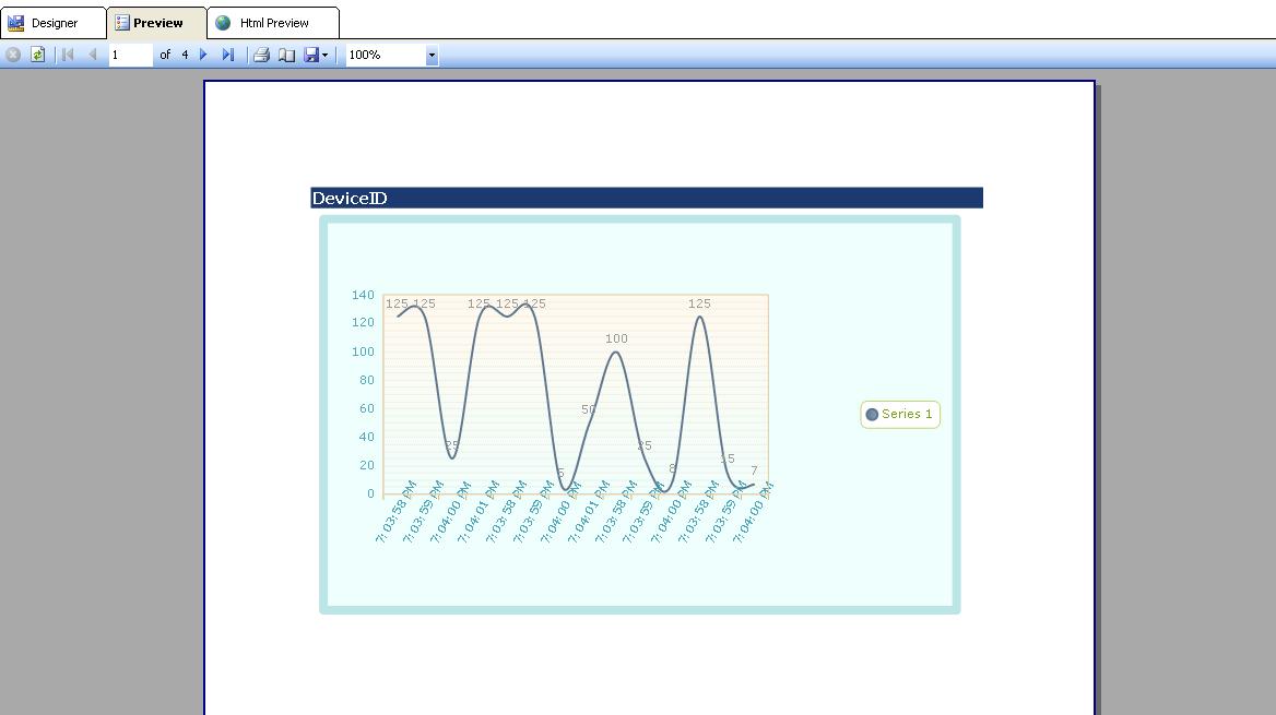 I have created a report with StackedSpline chart. The report should display the chart for each device with its parameter values(Y-Axis) vs DateTime(X-Axis). Following the code snippet of the report.