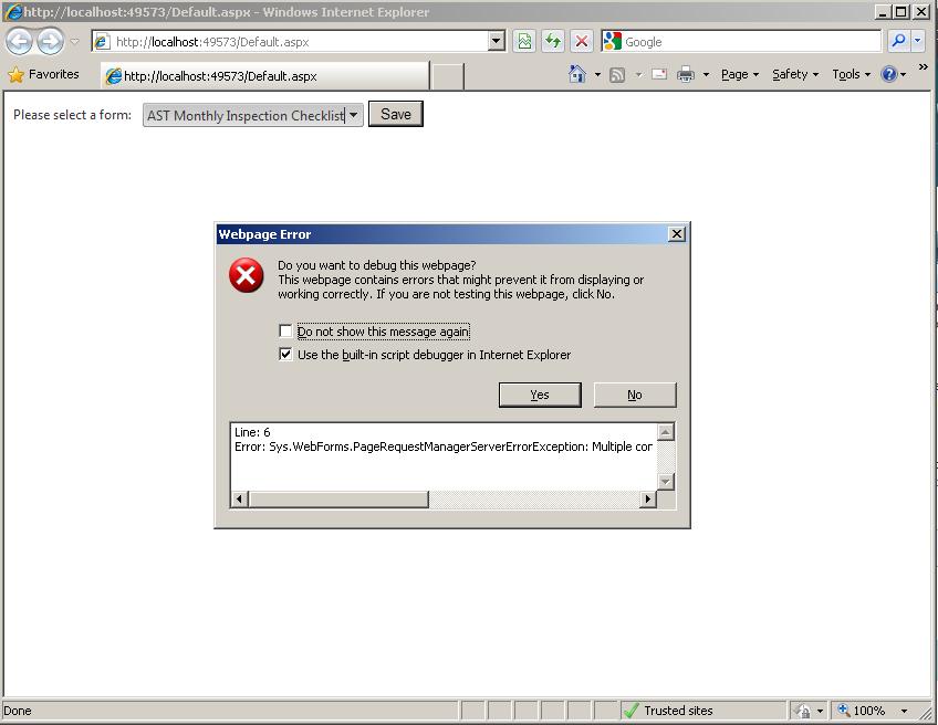 I'm evaluating Telerik RadControls in a web application. On a RadComboBox change I display another third party control (Aspose.Form) that show my InfoPath forms. I need to view them and on Save button on my page, I want to save that form. However I'm just stuck just getting it loaded on dropdown change event. I get this message: