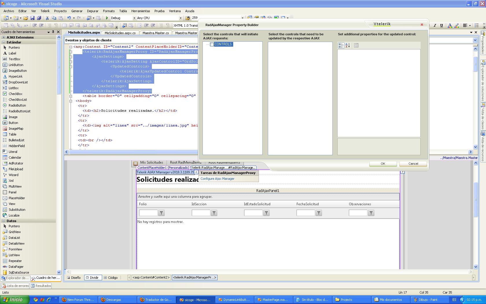 Also, when I put a RadAjaxManagerProxy in the contentPage and I try to configure it (Configure Ajax Manager), nothing controls are showed in the "Select the controls that will initiate AJAX request" panel and I cant configure anything.