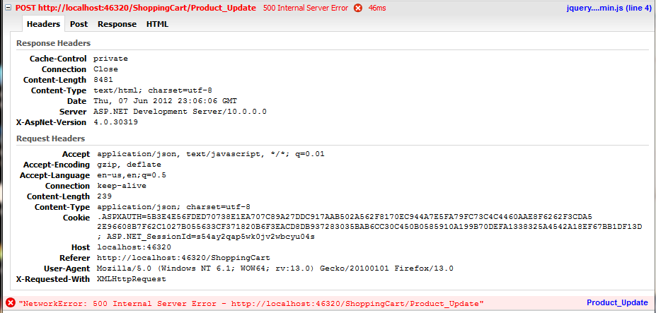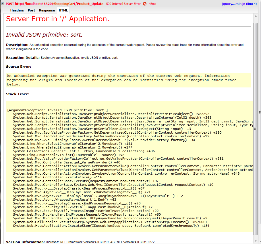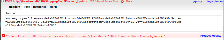 Invalid JSON primitive: sort." error (see attached). The error occurs before it hits the controller. A break point in the controller never gets hit. If I remove all the paramters from the controller i.e.: public ActionResult Product_Update() the program does hit the break point in the controller but it's pretty useless at this point.Please help.