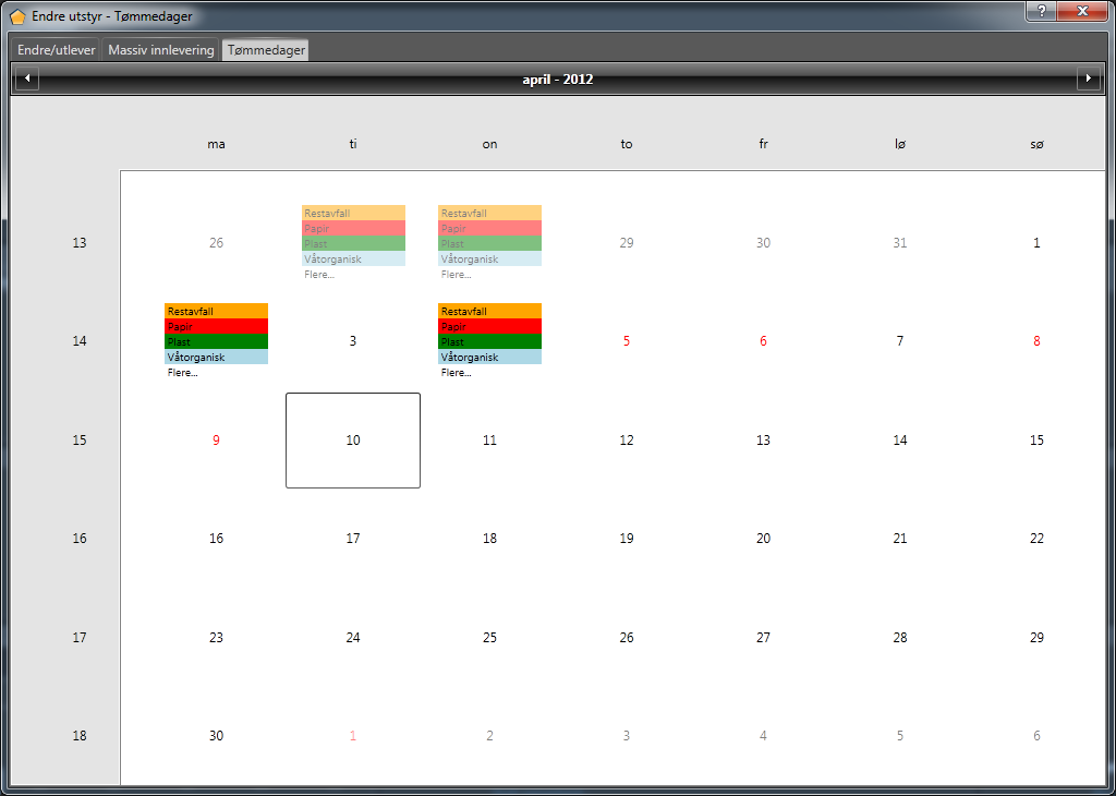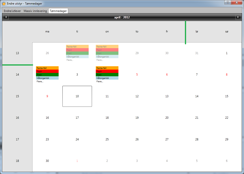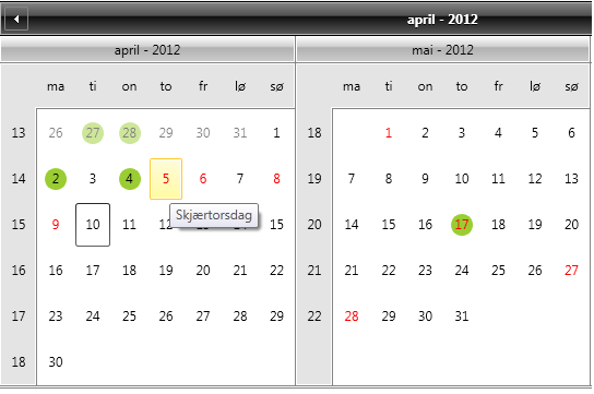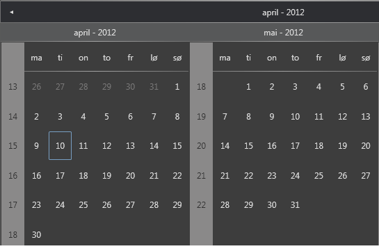 <Controls:RadCalendar x:Name="TommedatoKalender" Rows="3" Columns="4" SelectionMode="Extended" ViewsHeaderVisibility="Visible" DisplayDate="{Binding DisplayDate}"> <Controls:RadCalendar.DayTemplateSelector> <selector:KalenderDagSelector> <selector:KalenderDagSelector.DefaultTemplate> <DataTemplate> <TextBlock Text="{Binding Text}" Height="18" Width="18" TextAlignment="Center"/> </DataTemplate> </selector:KalenderDagSelector.DefaultTemplate> <selector:KalenderDagSelector.TommeDagTemplate> <DataTemplate> <Border BorderThickness="1" BorderBrush="{DynamicResource HighlightDayColor}" CornerRadius="12" HorizontalAlignment="Center" VerticalAlignment="Center" Background="{DynamicResource HighlightDayColor}"> <Grid> <!-- Rounded mask (stretches to fill Grid) --> <Border Name="mask" Background="{DynamicResource HighlightDayColor}" CornerRadius="7"/> <!-- Main content container --> <StackPanel> <!-- Use a VisualBrush of 'mask' as the opacity mask --> <StackPanel.OpacityMask> <VisualBrush Visual="{Binding ElementName=mask}"/> </StackPanel.OpacityMask> <!-- Content --> <TextBlock Text="{Binding Text}" Background="{DynamicResource HighlightDayColor}" Height="18" Width="18" TextAlignment="Center" /> </StackPanel> </Grid> </Border> </DataTemplate> </selector:KalenderDagSelector.TommeDagTemplate> </selector:KalenderDagSelector> </Controls:RadCalendar.DayTemplateSelector> </Controls:RadCalendar>