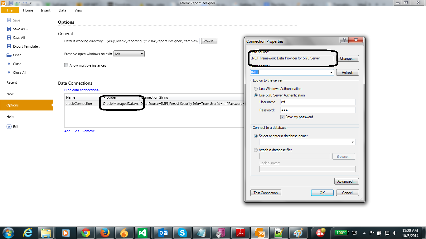 If you look at the Telerik connection setting, the provide is Oracle.ManagedDataAccess which I have used connect to Oracle using ODP.Net. At the same time, when open the connection in Edit mode the (third screen shot), by default the Data Source says that it has selected as .Net Framework Data Provider for SQL Server. But it should have been selected ODP.Net connection provider right? Even when i tried to change the provider I could not see any provide for ODP.Net. Is there any other settings do I need to apply or is that issue I installed the ODP.Net drivers after the Telerik installed (it's just my doubt) ?