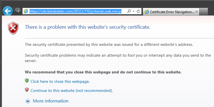 I'm want to reference https://cdn.kendostatic.com/2012.2.710/js/kendo.web.min.js (to prevent the "insecure content" warning messages) but the SSL certificate isn't right. Is this a known issue, and one that will be fixed, or do I need to host the Kendo files on my own servers?