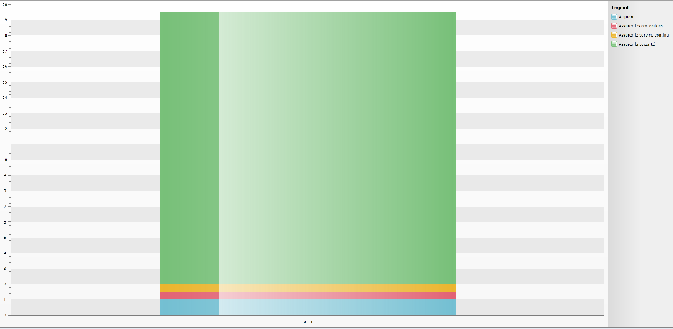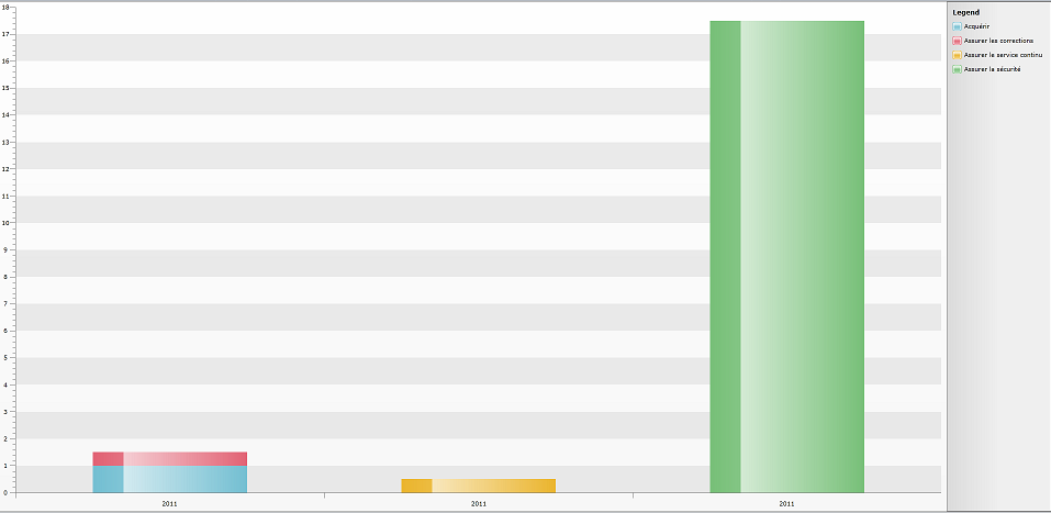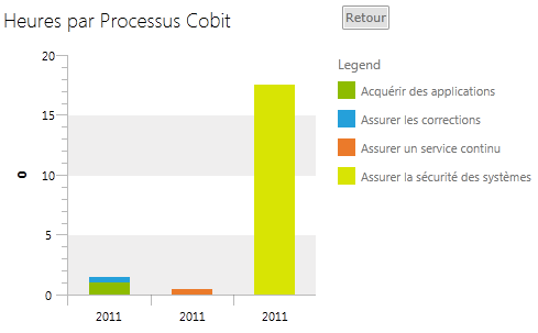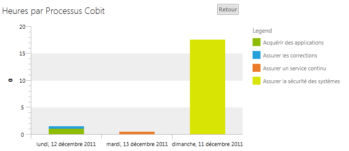 private void InitializeBarChartCobitProcessSeriesMappings() { SeriesMappingCollection seriesMappings = new SeriesMappingCollection(); foreach (string categorie in this.ListCobitProcess) { StackedBarSeriesDefinition seriesDefinition1 = CreateBarSeriesDefinition(); SeriesMapping seriesMapping1 = this.CreateSeriesMapping(categorie, seriesDefinition1, "Heures", ChartAggregateFunction.Sum); //seriesMapping1.GroupingSettings.GroupDescriptors.Add(new ChartYearGroupDescriptor("Date")); seriesMappings.Add(seriesMapping1); } this.BarChartProcessCobitSeriesMappings = seriesMappings; } private static StackedBarSeriesDefinition CreateBarSeriesDefinition() { StackedBarSeriesDefinition seriesDefinition = new StackedBarSeriesDefinition(); seriesDefinition.ShowItemLabels = false; seriesDefinition.LabelSettings.LabelDisplayMode = LabelDisplayMode.Inside; return seriesDefinition; } private SeriesMapping CreateSeriesMapping(string nom, SeriesDefinition seriesDefinition, string yValueField, ChartAggregateFunction aggFunction) { SeriesMapping result = new SeriesMapping(); result.LegendLabel = nom; result.SeriesDefinition = seriesDefinition; result.ItemMappings.Add(new ItemMapping("Date", DataPointMember.XCategory)); result.ItemMappings.Add(new ItemMapping(yValueField, DataPointMember.YValue, aggFunction)); result.FilterDescriptors.Add(new FilterDescriptor("Nom", FilterOperator.IsEqualTo, nom)); result.GroupingSettings.ShouldFlattenSeries = true; result.GroupingSettings.GroupDescriptors.Add(new ChartYearGroupDescriptor("Date")); return result; }Here the data send to the chart :