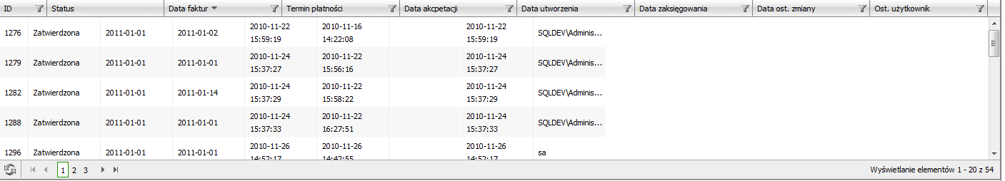 Html.Telerik().Grid<InvoicePackage>() .DataKeys(k => k.Add(o => o.Id)) .Localizable("pl-PL") .Name("InvoicePackageGrid") .DataBinding(dataBinding => dataBinding.Ajax().Select("_GetPackages", "Home")) .ClientEvents(events => events.OnRowSelected("onInvoicePackageRowSelected").OnDataBound("onInvoicePackageDataBound")) .Columns(c => { c.Bound(o => o.Id).Title("ID").Width(40); c.Bound(o => o.InvoiceStatus).Title("Status").Filterable(false).Width(100); c.Bound(o => o.InvoiceDate).Title("Data faktur").Format("{0:yyyy-MM-dd}").Width(100); c.Bound(o => o.InvoiceDueDate).Title("Termin płatności").Format("{0:yyyy-MM-dd}").Width(100); c.Bound(o => o.AcceptedAt).Title("Data akcpetacji").Format("{0:yyyy-MM-dd H:mm:ss}").Width(100); c.Bound(o => o.CreatedAt).Title("Data utworzenia").Format("{0:yyyy-MM-dd H:mm:ss}").Width(100); c.Bound(o => o.BookedAt).Title("Data zaksięgowania").Format("{0:yyyy-MM-dd H:mm:ss}").Width(100); c.Bound(o => o.LastChangedAt).Title("Data ost. zmiany").Format("{0:yyyy-MM-dd H:mm:ss}").Width(100); c.Bound(o => o.LastChangedBy).Title("Ost. użytkownik").Width(100); }) .Sortable(sorting => sorting.OrderBy(sortOrder => sortOrder.Add(o => o.InvoiceDate).Descending())) .EnableCustomBinding(true) .Pageable(paging => paging.PageSize(20)) .Scrollable() .Filterable() .Selectable() .Render()