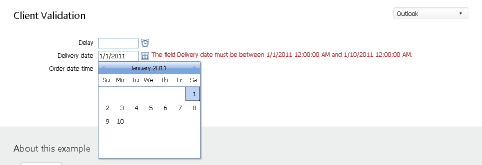 [DisplayName("Delivery date")][DataType(DataType.Date)][Required][Range(typeof(DateTime),"2011-Jan-01","2011-Jan-10")]publicDateTime? DeliveryDate{get;set;} - Compile and then browse to the demo page for the datepicker/clientvalidation.