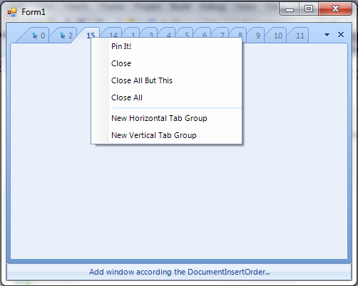 using System.Drawing; using System.Windows.Forms; using Telerik.WinControls.UI; using Telerik.WinControls.UI.Docking; public partial class Form1 : Form { private RadDock radDock1 = new RadDock(); public Form1() { InitializeComponent(); this.Load += new System.EventHandler(Form1_Load); this.Size = new Size(500, 400); } void Form1_Load(object sender, System.EventArgs e) { radDock1.Dock = DockStyle.Fill; radDock1.DocumentManager.DocumentInsertOrder = DockWindowInsertOrder.ToBack; this.Controls.Add(radDock1); var addWindowButton = new RadButton(); addWindowButton.Text = "Add window according the DocumentInsertOrder..."; addWindowButton.Click += new System.EventHandler(addWindowButton_Click); addWindowButton.Dock = DockStyle.Bottom; this.Controls.Add(addWindowButton); var addWindowFrontButton = new RadButton(); addWindowFrontButton.Text = "Add window to the front..."; addWindowFrontButton.Click += new System.EventHandler(addWindowFrontButton_Click); addWindowFrontButton.Dock = DockStyle.Bottom; this.Controls.Add(addWindowFrontButton); } void addWindowFrontButton_Click(object sender, System.EventArgs e) { var insertOrder = radDock1.DocumentManager.DocumentInsertOrder; DocumentWindow documentTop = new DocumentWindow(); documentTop.Text = radDock1.DockWindows.Count.ToString(); if (insertOrder != DockWindowInsertOrder.InFront) { radDock1.DocumentManager.DocumentInsertOrder = DockWindowInsertOrder.InFront; } this.radDock1.AddDocument(documentTop); radDock1.DocumentManager.DocumentInsertOrder = insertOrder; } void addWindowButton_Click(object sender, System.EventArgs e) { DocumentWindow documentTop = new DocumentWindow(); documentTop.Text = radDock1.DockWindows.Count.ToString(); this.radDock1.AddDocument(documentTop); } }Like this, if the current order is different when you want to perform an insert InFront, you just keep the old value, change the insert order, and insert the image, and after that change the value back.