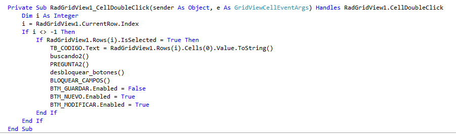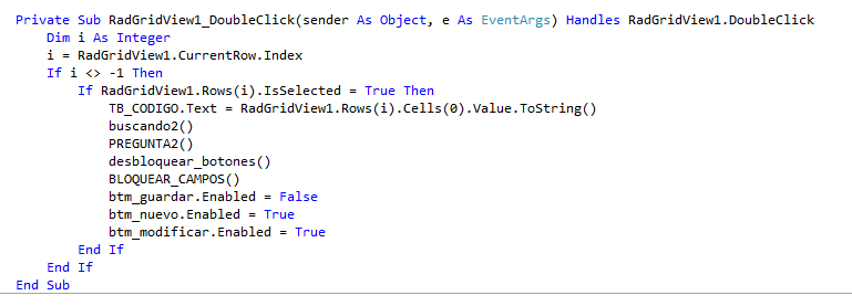 I have a form (see picture "form") I have a radgridview, when I want to double click on a row shows all the information in the upper controls, use the event doule click the radgridview (see picture "double click event" and "function1"). everything works fine up here.