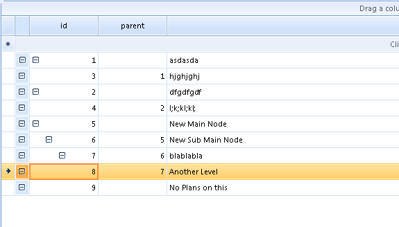 private void loadradGridView3() { radGridView3.DataSource = null; radGridView3.Columns.Clear(); radGridView3.Rows.Clear(); radGridView3.AutoSizeColumnsMode = GridViewAutoSizeColumnsMode.Fill; radGridView3.DataSource = CreateDataTableTestSuites(); radGridView3.ShowColumnHeaders = true; radGridView3.MasterTemplate.Columns["id"].IsVisible = true; radGridView3.MasterTemplate.Columns["parent"].IsVisible = true; radGridView3.MasterTemplate.Columns["id"].MaxWidth = 100; radGridView3.MasterTemplate.Columns["parent"].MaxWidth = 100; GridViewTemplate template = new GridViewTemplate(); template.DataSource = CreateDataTableTestPlans(); this.radGridView3.Templates.Add(template); GridViewRelation relation = new GridViewRelation(radGridView3.MasterTemplate, template); relation.RelationName = "GroupsPlans"; relation.ParentColumnNames.Add("id"); relation.ChildColumnNames.Add("group_id"); this.radGridView3.Relations.Add(relation); }I hope this helps.