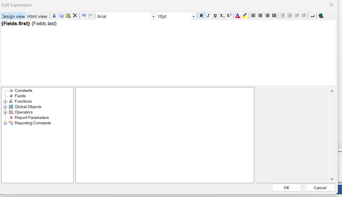 htmlTextBox1.Value expression [=<strong>Fields.FirstName</strong> + " " + Fields.LastName] is not valid: