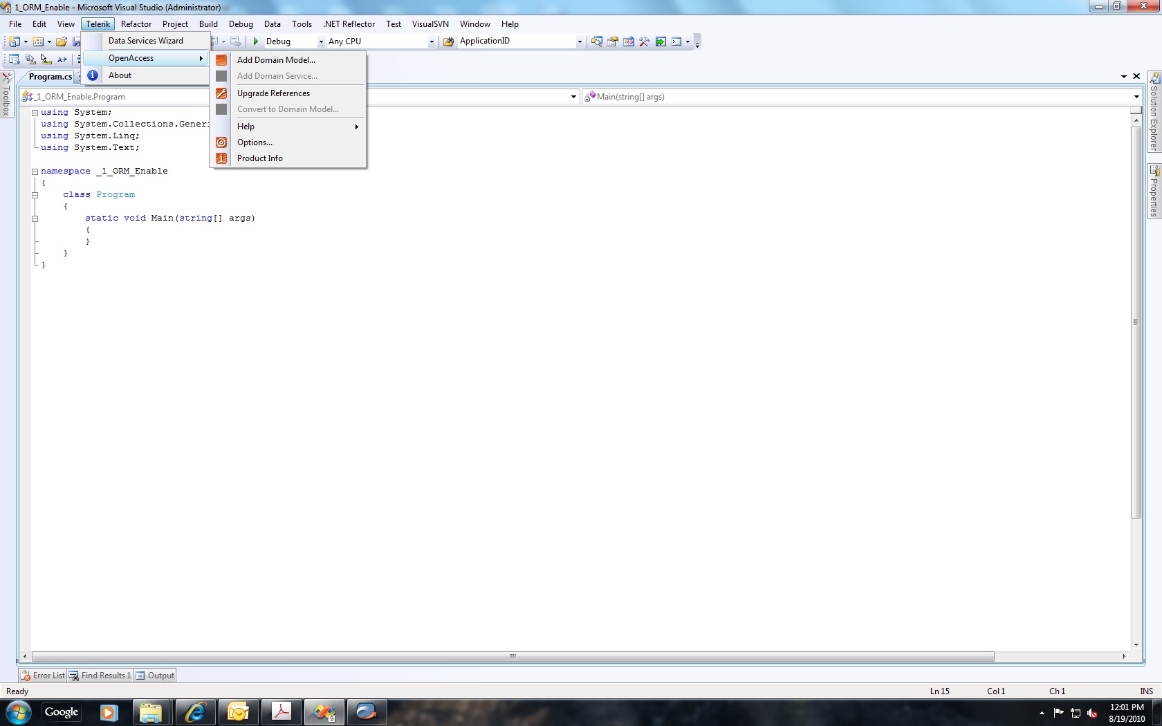 I have just installed OpenAccess ORM however the menu option to enable a project to use ORM is not showing up in Visual Studio. We are using Visual Studio 2008. Please see the attached screen shot of the current menu. Any suggestions as to how to get the enable a project to use ORM option to appear will be most appreciated. Thank you.