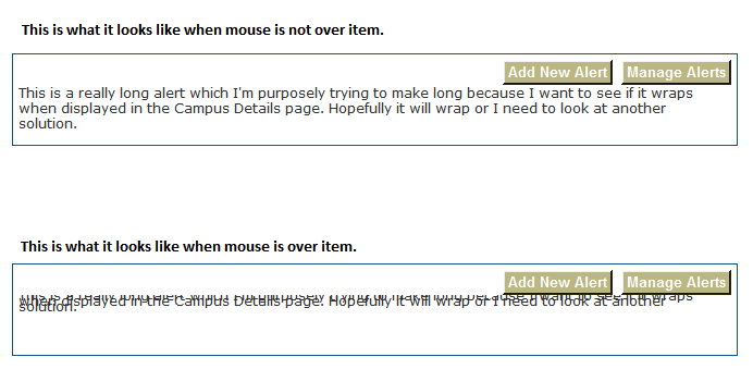 <telerik:RadRotator ID="radrotAlerts" runat="server" Skin="Hay" Width="650px" Height="50px" ItemWidth="650" ItemHeight="50" ScrollDirection="Up" ScrollDuration="1000" FrameDuration="3000" RotatorType="AutomaticAdvance"> <ItemTemplate> <div style="width:650px; height:50px; vertical-align:middle; text-align:left;"> <asp:Label ID="lblAlert" runat="server" Visible='<%# string.IsNullOrEmpty(Eval("AlertUrl").ToString()) ? true : false %>'> <%# Eval("AlertText") %> </asp:Label> </div> </ItemTemplate> </telerik:RadRotator>Attached are screenshots, one how it looks when mouse is NOT over item, one when it is.