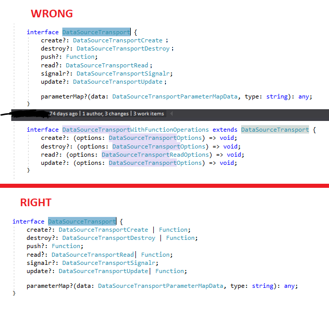 in kendo.all.d.ts is where it is defined that for properties in interface DataSourceTransport Function can be used in the interface and therefore does not want to DataSourceTransportWithFunctionOperations what is TypeScript 2.5 Compiler to compile the project.