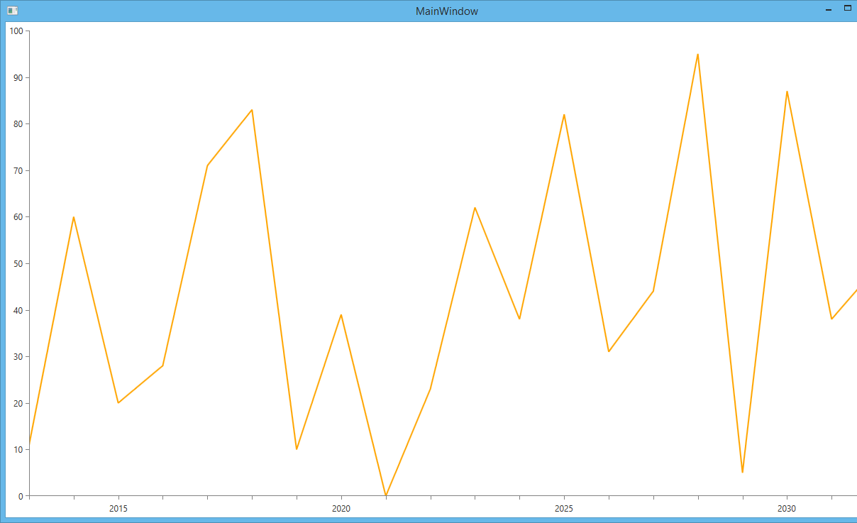 <telerik:DateTimeContinuousAxis Minimum="2015-1-1" MajorStepUnit="Year" MajorStep="5" LabelFormat="yyyy" />The Minimum property is used to set the start date in the axis, the MajorStepUnit sets the unit that defines the custom major step of the axis, the MajorStep set the step between two adjacent ticks and the LabelFormat is used to show only the year from the DateTime.