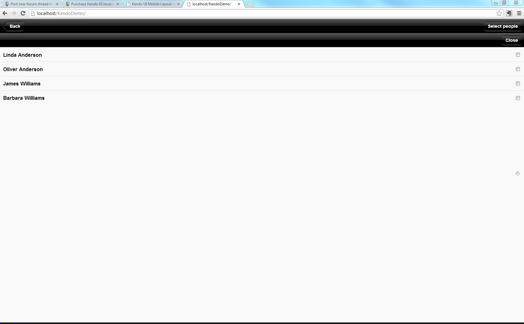 <!DOCTYPE html><html><head> <title></title> <script src="http://code.jquery.com/jquery-1.8.2.min.js"></script> <script src="http://cdn.kendostatic.com/2012.1.322/js/kendo.all.min.js"></script> <link href="http://cdn.kendostatic.com/2012.1.322/styles/kendo.common.min.css" rel="stylesheet"/> <link href="http://cdn.kendostatic.com/2012.1.322/styles/kendo.default.min.css" rel="stylesheet"/> <link href="http://cdn.kendostatic.com/2012.1.322/styles/kendo.mobile.all.min.css" rel="stylesheet"/></head><body> <div data-role="view" data-title="Tag people" id="popover"> <div data-role="header"> <div data-role="navbar"> <a id="back-button" class="nav-button" data-align="left" data-role="backbutton">Back</a> <span data-role="view-title"></span> <a data-align="right" data-rel="popover" href="#popover-people" data-role="button">Select people</a> </div> </div> <div data-role="content"> <img src="http://demos.kendoui.com/content/mobile/shared/faces.jpg" /> </div> <div data-role="popover" id="popover-people" data-popup='{"height": 230, "width": 350}'> <div data-role="view" data-title="People"> <div data-role="header"> <div data-role="navbar"> <span data-role="view-title"></span> <a data-role="button" data-align="right" data-click="closeParentPopover">Close</a> </div> </div> <ul data-role="listview"> <li><label>Isabella Anderson<input type="checkbox"></label></li> <li><label>Josh Anderson<input type="checkbox"></label></li> <li><label>Linda Anderson<input type="checkbox"></label></li> <li><label>Oliver Anderson<input type="checkbox"></label></li> <li><label>James Williams<input type="checkbox"></label></li> <li><label>Barbara Williams<input type="checkbox"></label></li> </ul> </div> </div> <div data-role="popover" id="popover-location" data-popup='{"height": 140, "width": 350}'> <div data-role="view"> <ul data-role="listview" data-click="closeParentPopover"> <li><label>Sydney, Australia <input name="location" type="radio"></label></li> <li><label>New York, USA <input name="location" type="radio"></label></li> <li><label>Miami, USA <input name="location" type="radio"></label></li> </ul> </div> </div> <div data-role="footer"> <div data-role="navbar"> <a data-align="right" href="#popover-location" data-rel="popover" data-role="button">Select location</a> </div> </div></div><style scoped> .km-ios #popover .km-view-title, .km-ios #popover-people .km-view-title { color: #fff; text-shadow: 0 -1px rgba(0,0,0,.5); } .km-ios #popover .km-navbar, .km-root > * > #popover > .km-content { background: -webkit-gradient(linear, 50% 0, 50% 100%, color-stop(0, rgba(255, 255, 255, 0.35)), color-stop(0.5, rgba(255, 255, 255, 0.1)), color-stop(0.5, rgba(255, 255, 255, 0)), color-stop(1, rgba(255, 255, 255, 0))) #000; } .km-ios #popover .km-navbar .km-button { background-color: #000; }</style><script> function closeParentPopover(e) { var popover = e.sender.element.closest('[data-role=popover]').data('kendoMobilePopOver'); popover.close(); }</script><script> var app = new kendo.mobile.Application(document.body);</script></body></html>Basically when the page loads, it appears as if the people popover is fully expanded and covers the entire page. Any insight as to what I'm missing would be much appreciated.