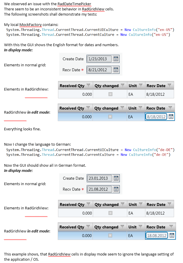 The good news is that we have recently introduced a new property of the RadGridView IsLocalizationLanguageRespected and you can use it to specify whether you want the CurrentCulture to be directly respected (setting IsLocalizationLanguageRespected="False").