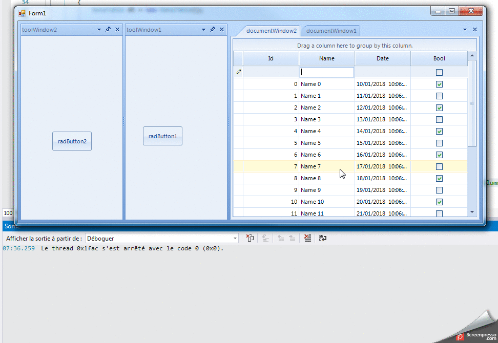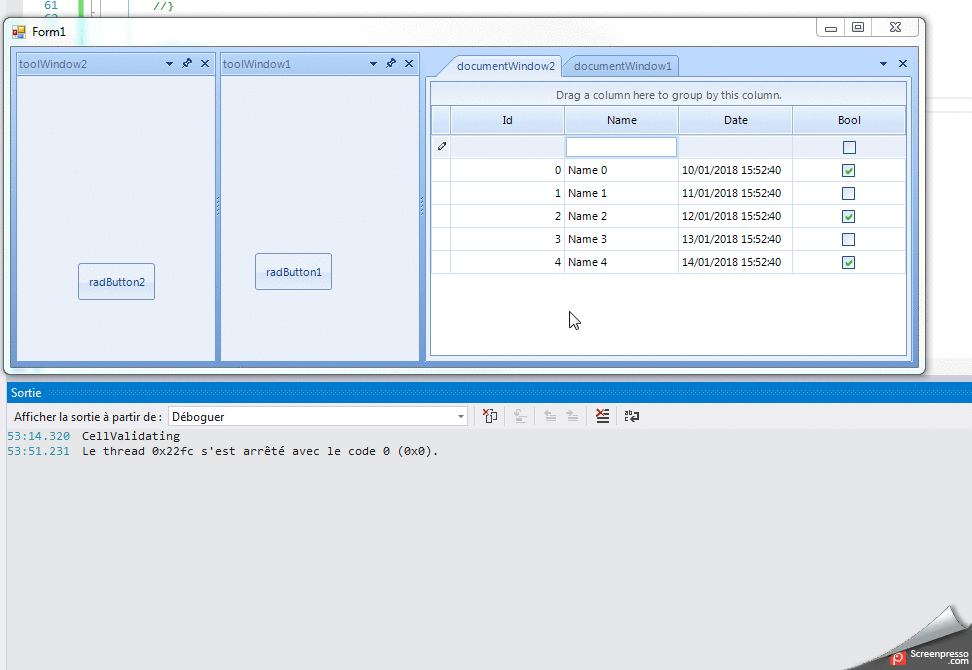 In a Form with a RadDock, in this RadDock two ToolWindows with one button each and two DocumentWindows. In a DocumentWindow, a RadGridView.