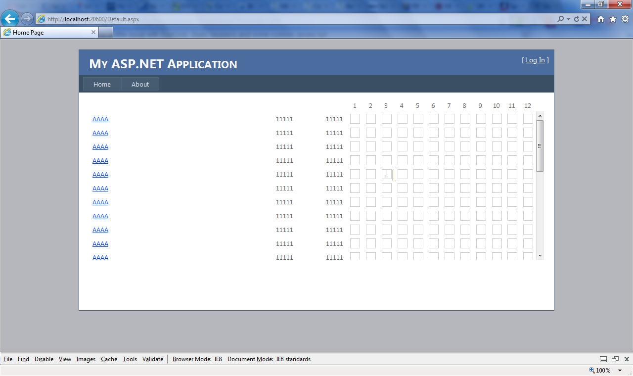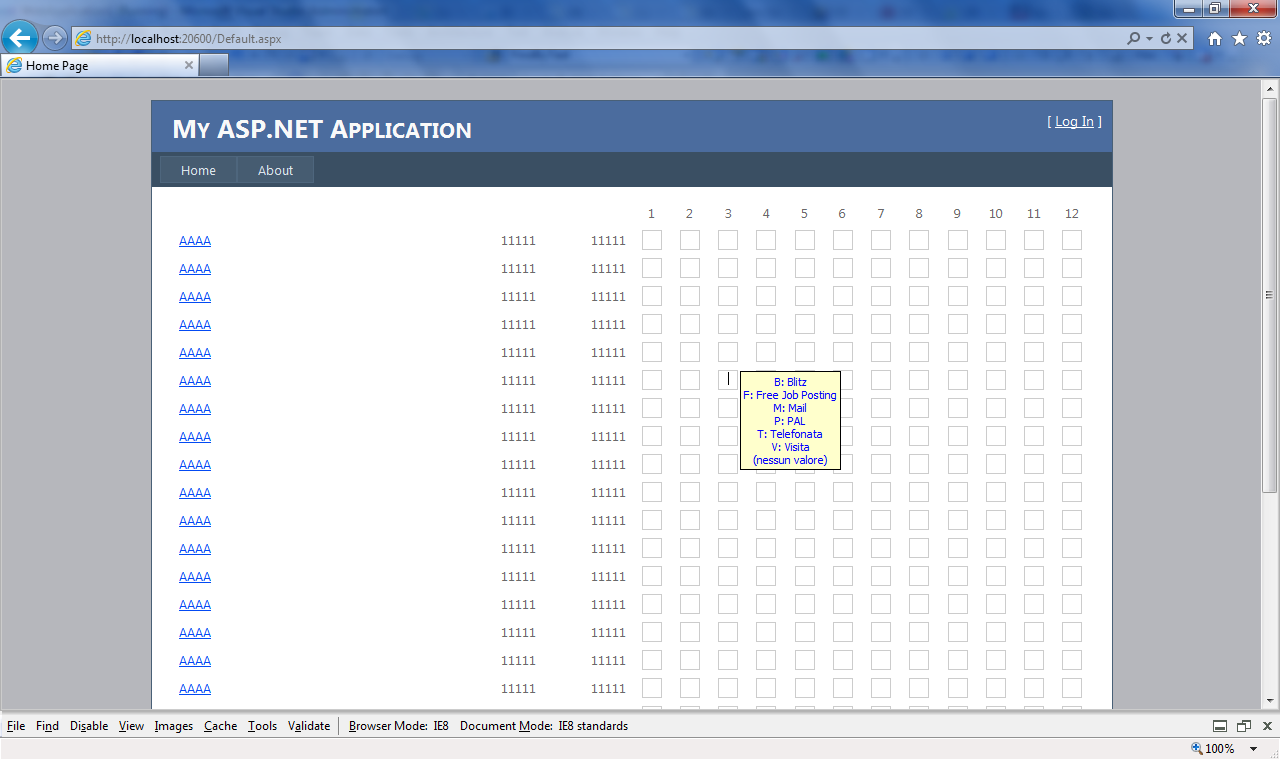 <%@ Page Title="Home Page" Language="C#" MasterPageFile="~/Site.master" AutoEventWireup="true" CodeBehind="Default.aspx.cs" Inherits="WebApplication1._Default" %><%@ Register Assembly="Telerik.Web.UI, Version=2010.2.713.40, Culture=neutral, PublicKeyToken=121fae78165ba3d4" Namespace="Telerik.Web.UI" TagPrefix="telerik" %><asp:Content ID="HeaderContent" runat="server" ContentPlaceHolderID="HeadContent"> <script type="text/javascript"> var arrInizialiAttivita = ["B", "F", "M", "P", "T", "V"]; var inizialiAttivita = arrInizialiAttivita.join(""); var currentTextBox = null; var zParent = 0; function check(obj) { if (obj.value.length > 0) { return false; } currentTextBox = obj; var key = window.event.keyCode; if (key == 8) {//backspace return true; } if (key == 13) {//invio return false; } if (key == 27) {//esc return false; } var keyCharUpperCase = String.fromCharCode(key).toUpperCase(); var keyCodeUpperCase = keyCharUpperCase.charCodeAt(0); window.event.keyCode = keyCodeUpperCase; if (inizialiAttivita.indexOf(keyCharUpperCase) != -1) { closeHelp(); return true; } else { openHelp(obj, "error"); return false; } } function openContext(obj) { if (window.event.button == 2) { currentTextBox = obj; openHelp(obj, "context"); } return false; } function openHelp(obj, mode) { if (mode == "error") { document.getElementById("spanText").style.display = "block"; } else { document.getElementById("spanText").style.display = "none"; } var helpNode = document.getElementById("divHelp").removeNode(true); helpNode = obj.offsetParent.appendChild(helpNode); helpNode.style.display = "block"; zParent = zParent + 1; obj.offsetParent.style.zIndex = zParent; } function closeHelp() { document.getElementById("divHelp").style.display = "none"; currentTextBox = null; } function setTextBoxValue(val) { currentTextBox.value = val; document.getElementById("divHelp").style.display = "none"; currentTextBox = null; } document.onclick = closeHelp; </script> <style type="text/css"> #divHelp { border: 1px solid black; padding: 3px; background-color: #FFFFCC; font-family: Tahoma; font-size: 11px; display: none; top: 2px; left: 22px; position: absolute; } #spanTblHelp { white-space: nowrap; } #spanText { white-space: nowrap; } #divHelp a:link, #divHelp a:visited, #divHelp a:active, #divHelp a:hover { text-decoration: none; color: #0000ff; } .spanContainer { position: relative; } .txtBox { width: 16px; height: 16px; border: 1px solid #cccccc; font-family: Tahoma; font-size: 11px; text-align: center; } </style> <script type="text/javascript"> function CheckAll(checkAllBox, ColumnName) { var actVar = checkAllBox.checked; for (i = 0; i < theForm.length; i++) { e = theForm.elements[i]; if (e.type == 'checkbox' && e.name.indexOf(ColumnName) != -1) e.checked = actVar; } } function OnClientDropDownClosing_UpdateText(sender, eventArgs) { var items = sender.get_items(); var itemsCount = items.get_count(); var ultimoCheck; var label = ""; var count = 0; for (var itemIndex = 0; itemIndex < itemsCount; itemIndex++) { var item = items.getItem(itemIndex); var checkbox = getItemCheckBox(item); if (checkbox) { if (checkbox.checked) { count++; if (label == "") { label = items.getItem(itemIndex).get_text(); } else { label = label + ', ' + items.getItem(itemIndex).get_text(); } } } } // if (count > 1) { // label = count + " selected"; // } sender.set_text(label); } function getItemCheckBox(item) { //Get the 'div' representing the current RadComboBox Item. var itemDiv = item.get_element(); //Get the collection of all 'input' elements in the 'div' (which are contained in the Item). var inputs = itemDiv.getElementsByTagName("input"); for (var inputIndex = 0; inputIndex < inputs.length; inputIndex++) { var input = inputs[inputIndex]; //Check the type of the current 'input' element. if (input.type == "checkbox") { return input; } } } // function OnClientDropDownClosing(combobox) // { // var i; // for (i = 0; i < combobox.Items.length; i++) // { // if(combo.Items[i].Checked) // alert(combo.Items[i].Text); // } // // } </script></asp:Content><asp:Content ID="BodyContent" runat="server" ContentPlaceHolderID="MainContent"> <div id="divHelp" oncontextmenu="return false"> <span id="spanText">Valore non consentito.<br /> I valori ammessi sono:</span> <span id="spanTblHelp"><a href="#" onclick="setTextBoxValue('B')"> B: Blitz</a><br /> <a href="#" onclick="setTextBoxValue('F')">F: XXX</a><br /> <a href="#" onclick="setTextBoxValue('M')">M: Mail</a><br /> <a href="#" onclick="setTextBoxValue('P')">P: PPP</a><br /> <a href="#" onclick="setTextBoxValue('T')">T: Telefonata</a><br /> <a href="#" onclick="setTextBoxValue('V')">V: Visita</a><br /> <a href="#" onclick="setTextBoxValue('')">(nessun valore)</a> </span> </div> <asp:ScriptManager ID="MasterScriptManager" runat="server" AsyncPostBackTimeout="300" ScriptMode="Release"> </asp:ScriptManager> <telerik:RadGrid ID="PCG" runat="server" AllowSorting="true" AutoGenerateColumns="False" ShowFooter="true" AllowPaging="True" EnableEmbeddedSkins="false" EnableViewState="true" ViewStateMode="Enabled" PageSize="100"> <PagerStyle HorizontalAlign="Left" Mode="NumericPages" ShowPagerText="false" /> <FooterStyle VerticalAlign="Top" /> <ClientSettings> <Scrolling AllowScroll="true" UseStaticHeaders="true" /> </ClientSettings> <MasterTableView DataKeyNames="IdCliente,Email" runat="server" PageSize="100" TableLayout="Auto" AllowSorting="true" ShowFooter="true" EnableViewState="true" ViewStateMode="Enabled"> <PagerStyle CssClass="GridPager" Mode="NumericPages" ShowPagerText="false" /> <Columns> <telerik:GridTemplateColumn SortExpression="RagioneSociale" UniqueName="RagioneSociale"> <HeaderStyle Width="250px" /> <FooterStyle Wrap="false" /> <ItemTemplate> <asp:LinkButton runat="server" CssClass="LabelNoWrapStyle" CommandName="DettagliaLink" ID="lblRagioneSociale" Text="AAAA"></asp:LinkButton> </ItemTemplate> </telerik:GridTemplateColumn> <telerik:GridTemplateColumn> <HeaderStyle Width="80px" /> <FooterStyle Wrap="false" /> <ItemStyle Hori