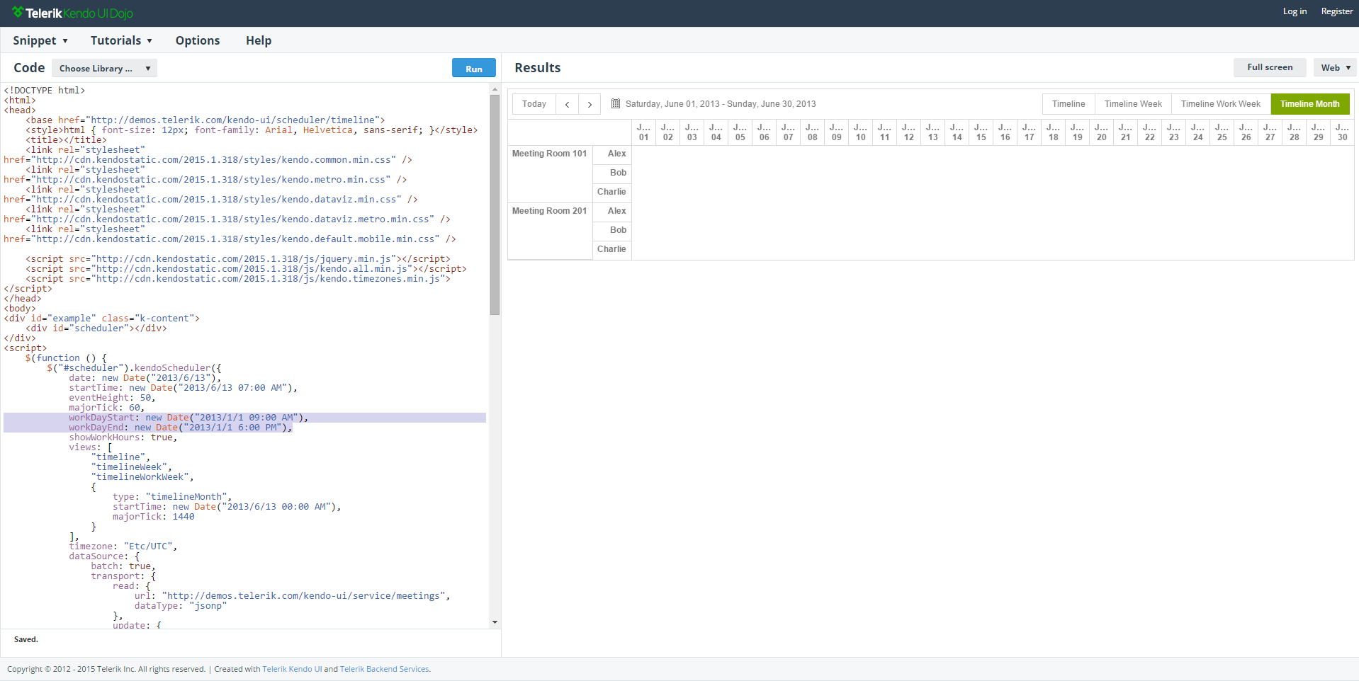 $("#scheduler").kendoScheduler({ date: new Date("2013/6/13"), startTime: new Date("2013/6/13 07:00 AM"), height: 600, navigate: function(e) { if (e.action === "changeWorkDay" && this.view().name === "timelineMonth") { if (e.isWorkDay) { this.options.majorTick = 360; } else { this.options.majorTick = 1440; } } },Regards,