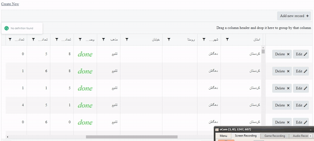 @model IEnumerable<DomainClasses.Person.Person>@using Utilities.Convertor@using Kendo.Mvc.UI@{ Layout = "_DefaultLayout2"; ViewData["Title"] = "Index";}<h2>Index</h2><p> <a asp-action="Create">Create New</a></p><div class="row" style="color:#03db22"> <div class="col-xl-12 k-rtl"> <div id="grid"> @{ var maritalStatusTemplate = "# if (data.MaritalStatus==2) { # <i class='material-icons' style='color:limegreen;font-size:xx-large'>done</i> # } #"; //var blueRayTemplate = "# if (data.BlueRay) { # <i class='fa fa-check' aria-hidden='true'></i> # } #"; } @(Html.Kendo().Grid<DomainClasses.Person.Person>() .Name("grid") .Navigatable() .Sortable() .Editable() .Groupable() .Filterable() .Pageable(pg => { pg.AlwaysVisible(true); pg.ButtonCount(5); pg.Enabled(true); pg.PageSizes(new int[] {5,10,20,30,40}); pg.Refresh(true); pg.Responsive(true); pg.PreviousNext(true); pg.Numeric(true); }) .Scrollable(sc=>sc.Virtual(true)) .ToolBar(x => { x.Create(); }) .Columns(columns => { columns.Bound(column => column.PersonType).EditorTemplateName("ClientPersonTypeEditor").Width(90); columns.Bound(column => column.PersonId).Width(100); columns.Bound(column => column.Name).Width(150); columns.Bound(column => column.Family).Width(180); columns.Bound(column => column.AliasName).Width(100); columns.Bound(column => column.FatherName).Width(100); columns.Bound(column => column.BirthDate).ClientTemplate("#: BirthDatePersian #").Width(110); columns.Bound(column => column.BirthCertificate).Width(100); columns.Bound(column => column.NationalNumber).Width(100); columns.Bound(column => column.Province).Width(180); columns.Bound(column => column.County).EditorTemplateName("ClientCountyEditor").Width(100); columns.Bound(column => column.Village).Width(150); columns.Bound(column => column.Street).Width(180); columns.Bound(column => column.Madhhab).Width(100); columns.Bound(column => column.MaritalStatus).ClientTemplate(maritalStatusTemplate).HtmlAttributes(new { style = "text-align: center" }).Width(100); columns.Bound(column => column.NumberOfWife).Width(100); columns.Bound(column => column.NumberOfBoy).Width(100); columns.Bound(column => column.NumberOfGirl).Width(100); columns.Bound(column => column.WNCAYIF).Width(100); columns.Bound(column => column.PersonnelCode).Width(100); columns.Bound(column => column.Workplace).Width(100); columns.Bound(column => column.MembershipDate).ClientTemplate("#: MembershipDatePersian #").Width(110); columns.Bound(column => column.MilitaryService).Width(100); columns.Bound(column => column.ServiceOrgan).Width(100); columns.Bound(column => column.Category).Width(100); columns.Bound(column => column.PlaceOfTraining).Width(100); columns.Bound(column => column.DateOfTraining).ClientTemplate("#: DateOfTrainingPersian #").Width(110); columns.Command(column => { column.Edit(); column.Destroy(); }).Locked().Width(200); }) .DataSource( ds => ds.Ajax() .ServerOperation(true) .PageSize(20) .Read(r => r.Action("GetAllPersons", "People")) ) ) </div> </div></div>