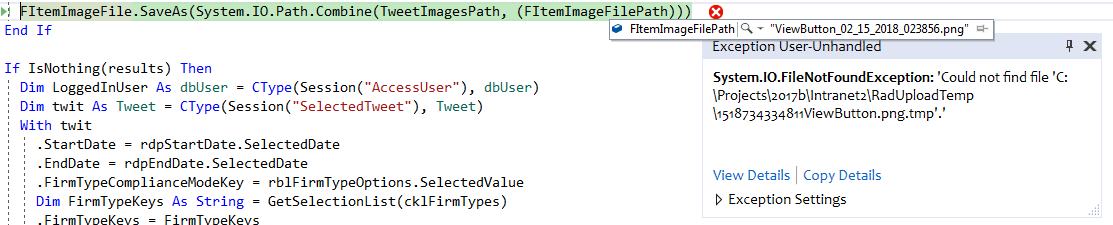 I am using version 2017.3.913.40. The code segment to save a file, using the AsyncUpload control, works only the first time. If I upload a different file, I would the get an error message, see attachment, that it tried to look for a file with extension .tmp. I put the following lines in the Web.config, based on a suggestion on a thread I found. But it doesn't seem to fix the problem. Could you help?