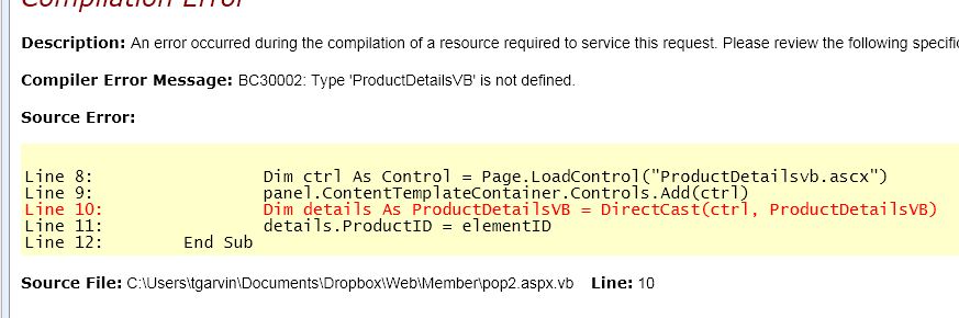 I can get 95% of the way, and then I find an error that makes no sense to me. The attached screen shot indicates a problem with creating an instance of the custom control as "ProductDetailsVB" not defined. This is actually detected in VS2010, but I ran the code to create a better error description.