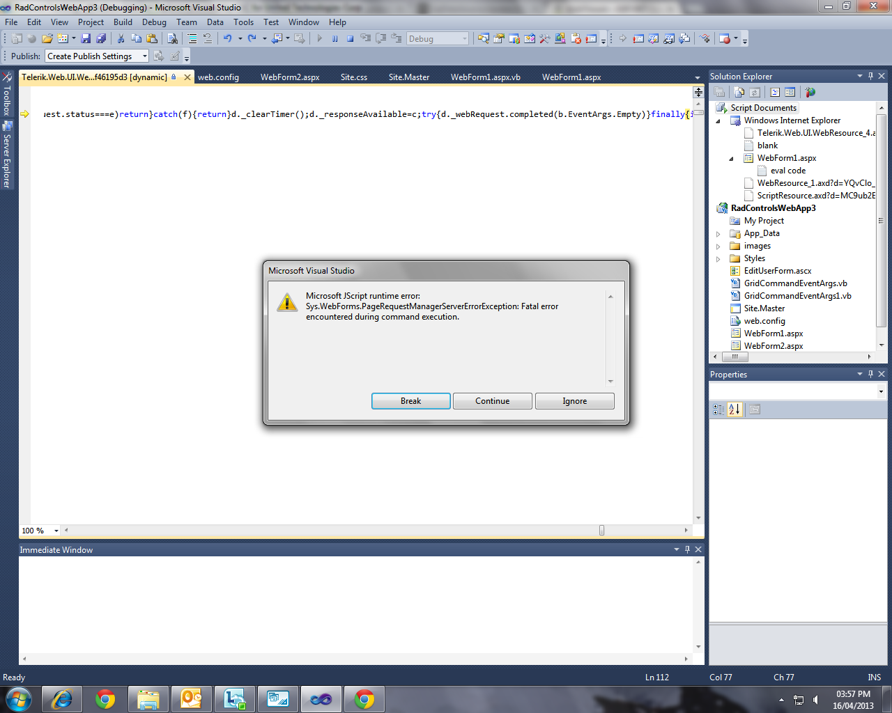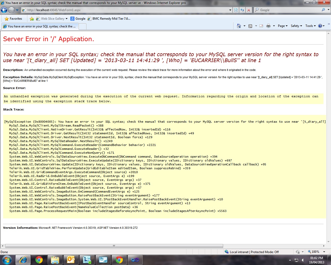 hi i have a vb web app. im using a radgrid to display the information from a SQL view and the popup edit form to edit the information in a SQL table the radgrid works and the data from the table is binded to the edit components but when i click the update button it returns a message in visual studio i have attached a screen print.