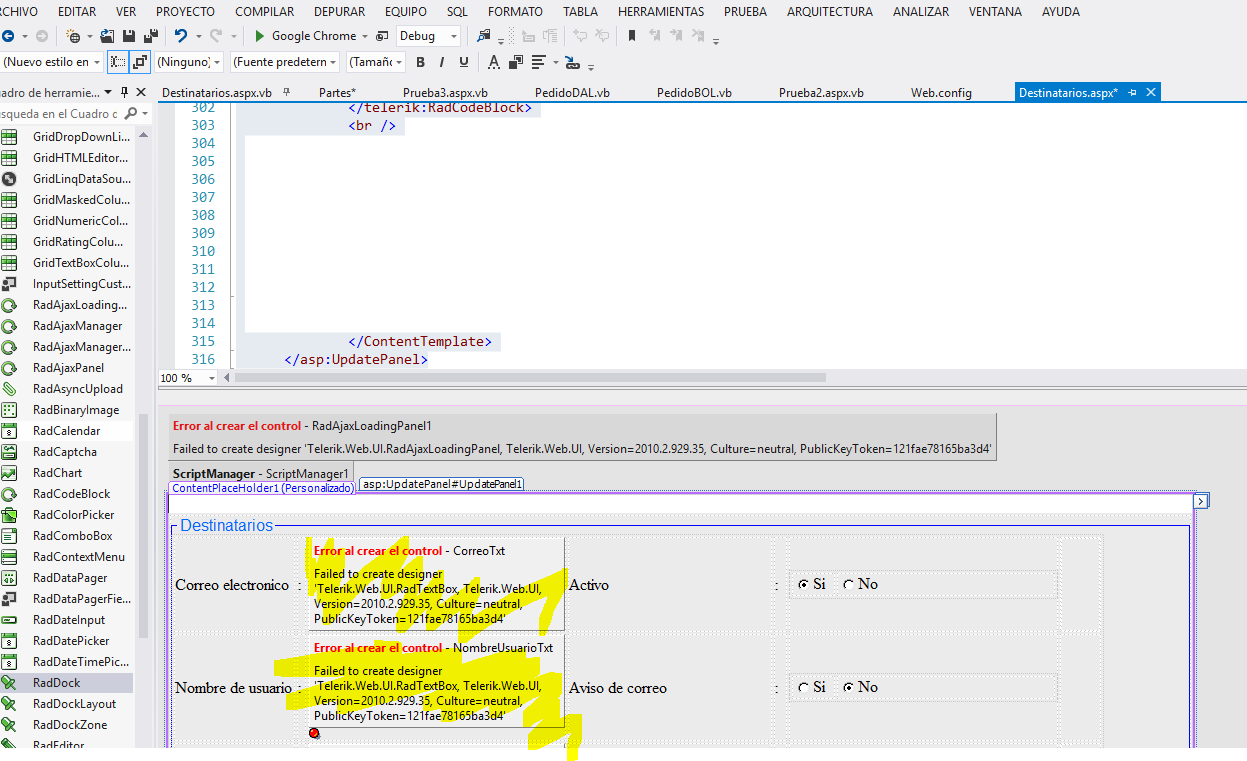 I changed by other computer my desktop, and install VS with Telerik, but this dont work in the designer of VB.. so sorry by my english.